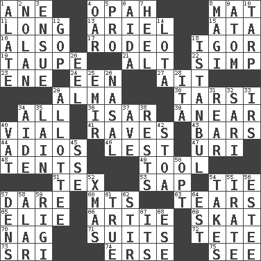 ACROSS 1. A saturated hydrocarbon 4. Brightly colored fish 8. Floor protector 11. Protracted 13. Satellite of Uranus 15. _ moment's notice (2 wds.) 16. In addition 17. Cowboy competition 18. Russian composer Stravinsky 19. Grayish beige 21. The first octave above the treble staff 22. Simple or foolish person 23. Compass dir. 24. Car or cant ending 27. Small island 29. _ mater 30. Tarsus (plural) 34. Everything 36. Austrian river, tributary to the Danube 39. Approach 40. Small bottle 41. All-night dance parties 43. Taverns 44. Goodbye (Sp.) 46. For fear that 47. RI univ. 48. Portable shelters 49. Instrument 51. John Ritter's dad 53. Plant excrement 54. Standoff 57. Have the gumption 60. Mountains (abbr.) 63. Pulls into pieces 65. Writer Wiesel 66. Nick name for Arthur 69. Three-handed card game 70. Tired old horse 71. Sets of matching outer garments 72. Wig 73. Indian title of respect (Mr.) 74. Celtic language 75. Observe DOWN 1. Having winglike extensions 2. Pitcher Ryan 3. Follow as a consequence or result 4. Rowing implement 5. Adept person 6. Opera by Verdi 7. The bottom of a shoe or boot 8. Wise men 9. Smallest unit of an element 10. Canvas cover 12. Grand Old Party 14. Globular water bottle used in Asia 18. Byzantium, centuries later 20. Snakelike fish 25. Independent ruler or chieftain 26. Rhinal 28. Call ___ day 29. One to whom something is allotted 31. Stern 32. Indian skirt 33. Big collection agency 34. Assistant 35. (Had) reclined 37. "___ Maria" 38. Musical pauses 40. Large container 42. Portico 45. Compass dir. 50. Choose 52. Dec. holiday 54. Receives possession of 55. Feeling or showing extreme anger 56. First name in cosmetics 57. Cub Scout units 58. Having or resembling wings 59. Swiss mountan, "Queen of the Mountains" 61. Loyal 62. Agitate 64. Eastern Standard Time (abbr.) 67. ___ a Wonderful Life 68. Compass dir.