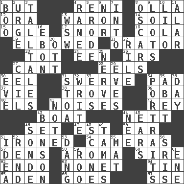 ACROSS 1. Yet 4. Painter Guido (1575-1642) 8. Rounded earthenware pot or jar 12. Mouth or opening 13. Make _____ (do battle with) 14. The visible part of the earth's surface 15. Stare 17. Derisive sound 18. Root beer relative 19. Shoved, as through a crowd 21. Speaker 23. Small child 24. Car or cant ending 26. Big collection agency 27. Patter 28. Snakelike fish 30. Snakelike fish 31. Turn aside suddenly 34. Groovy apt. 37. Compete 38. Collection of objects 39. Chief or king in Benin or Nigeria 40. Raised railways 41. Annoying sounds 42. Marina Del _, California 43. Water vessel 44. Remaining after all deductions 46. Arrange properly for use 47. Eastern Standard Time (abbr.) 50. Hearing organ 51. Pressed 54. Devices for capturing images 57. Habitations of wild animals 58. Scent 60. Beget 62. Inside; within (prefix) 63. Music written for nine 64. Metal container 65. Arabian gulf 66. Moves 67. Compass dir. DOWN 1. Surprise greeting 2. Goad 3. Baron Munchausen's specialties 4. The wife of a rajah (variant) 5. Wear away 6. Not either 7. To the inside or interior of 8. Motion picture awards 9. Plunders 10. _ and Stitch 11. Having or resembling wings 13. Compass dir. 16. Inky black, to poets 20. Baseball player Mel 22. Cause heat under the collar 25. Impudent aggressiveness 27. To provide with a ceiling 29. Nights before holidays 30. First lady 31. Portico 32. Compose 33. Greek goddess of the dawn 34. Likenesses of persons 35. Collude with 36. 24 hours 41. Observe 43. Gillaume's butler role 44. Born 45. Hearing organs 46. Message 48. Biscuitlike quick bread 49. Domesticates 51. It may be bright or harebrained 52. Tear apart 53. Mild oath, euphamism for damn 55. Floor covering 56. Indian titles of respect 59. Friend of Pooh 61. Compass dir.