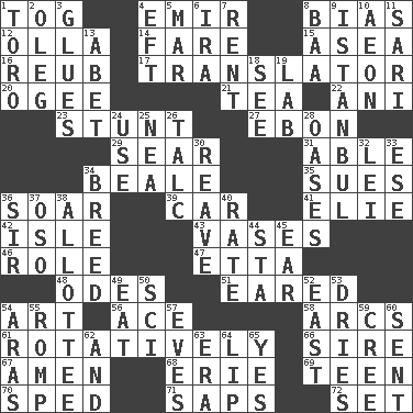 ACROSS 1. Coat; cloak 4. Arab leader 8. Prejudice 12. Spanish pot 14. Conductor's collection 15. At sea 16. Reuben's nickname 17. Interpreter 20. Double curve, resembling the letter S 21. Afternoon social gathering 22. Cuckoo 23. Difficult or unusual or dangerous feat 27. Inky black, to poets 29. Shrivel 31. Competent 34. Calif. Air Force Base 35. Institutes legal proceedings 36. Fly high 39. Automobile 41. Writer Wiesel 42. Small island 43. Flower holders 46. Hero or heavy, e.g. 47. Singer James 48. Lyric poems 51. Having ears or earlike features 54. Nonscientific branch of learning 56. Adept person 58. Arches 61. Happening in regular succession 66. Male parent of an animal 67. So be it 68. One of the Great Lakes 69. Adolescent 70. Moved rapidly 71. Plant excrements 72. Arrange properly for use DOWN 1. "Corrida" creature 2. Cassini of fashion 3. Adhesives 4. Newt 5. Impair 6. Retirement account (abbr.) 7. Monthly bill 8. Sound made by sheep 9. Byzantium, centuries later 10. Age 11. Indian skirt 13. Collude with 18. Observe 19. Experiment locale 24. Purpose 25. Teachers' org. 26. Baby powder 28. Fertile tracts in a desert 30. Break or tear apart 32. Luau accessory 33. Compass dir. 34. A special lineage 36. Title for a knight 37. Bear (Spanish) 38. One to whom something is allotted 40. Assign a rank or rating to 44. R.R. building 45. Hearing organ 49. Erode 50. _-fi 52. 90 degrees 53. Frees from moisture 54. Ancient river in northeast Turkey 55. Frolic 57. Nights before holidays 59. Algonquian 60. Emitted 62. Added to 63. Period 64. Mouth edge 65. Consenting reply