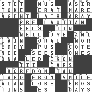 ACROSS 1. Proofreading order 5. Large cup 8. SW Saudi Arabia district 12. Casino tip 13. Part of Q.E.F. 15. Female horse 16. Rep 18. Den 19. Like ___ of sunshine 20. Before (prefix) 22. Of or relating to Laos or its people 24. Snakelike fish 26. Metal container 27. Famous astronaut Armstrong 28. Color 29. Cuckoo 32. (Had) reclined 35. Spoken 37. Or not 38. Whirlpool 39. Festering 40. ____ d'Azur (French Riviera) 41. Born 42. Observes 43. Washington bills 44. Heredity factor (abbr.) 45. Directed 46. Visual representation of an object 49. One more than two 50. Hearing organs 51. Mood resulting from idleness 55. The 19th letter of the Greek alphabet 56. Pacific island yam 57. Inky black, to poets 59. Grin 63. Actor Alda or Thicke 64. Ear part 65. Greek god of love 66. Airtight sealed metal containers 67. Eastern Standard Time (abbr.) 68. 24-hour periods DOWN 1. R.R. building 2. Coat; cloak 3. Supplement with great effort 4. 3-inch nail 5. Cartoonist voice _ Blanc 6. Mountain range 7. Greek goddess of the earth (variant) 8. With great haste 9. "Two Mules for Sister ____" 10. SW Asia republic 11. Marina Del _, California 14. Trinitrotoluene 17. Relationship diagram 21. Biblical high priest 23. Neckwear 25. Slanted 28. Hyrax 29. At once, immediately (arch.) 30. Short letter 31. Angers 32. Grant temporary use of 33. An important port of Yemen 34. The main thing one is thinking about 36. Sorrow 40. Eaten 42. A glass for beer 45. Untruth 47. Krazy ___ of comics 48. Mouths or openings 49. Removes the wrinkles 51. Indonesian resort city 52. Northwest Algerian city 53. Mitch Miller's instrument 54. Crowds into 56. Make lace 58. Fish or hair follower 60. Retirement account (abbr.) 61. Myrna of the movies 62. Double-curved letter