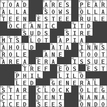 ACROSS 1. Frog relative 5. Ancient Greek god of war 9. Lightbulb-shaped fruit 13. Silent film actress Nazimova 14. Sty mamas 15. Water jar 16. Adolescent 17. First name in cosmetics 18. Court order 19. Pertaining to the sea 21. It would 22. Beer foam 23. Beget 24. Mountains (abbr.) 27. Car dealer's back yard 28. Capital of Western Samoa 29. Hold, grip (Informal) 31. _ moment's notice (2 wds.) 32. Taverns 36. Hero or heavy, e.g. 37. One (Scot) 38. A blast of a horn 39. Length times width 40. Epoch 41. Come out of 42. Unclean, religiously 44. Greek goddess of the dawn 46. Eastern Standard Time (abbr.) 47. Silvers or Donahue 48. _ and Stitch 50. Directed 51. Commissioned military rank 54. Play the lead 56. Timepiece 58. Cassini of fashion 60. Quote 61. Scratch 62. Grandmother 63. On the rocks 64. Perceives with the eye 65. Southwest Nigerian state DOWN 1. Make lace 2. Margarine 3. Actor Baldwin 4. Natives or inhabitants of Denmark 5. Help 6. College mil. group 7. She-sheep 8. Compass dir. 9. Likenesses of persons 10. Dodge 11. 100% 12. Actress Charlotte 17. Inside; within (prefix) 20. Old (Scot.) 21. One more than two 23. Health resort 24. Hindu Mythology: god of death 25. Son of Odin 26. Not divided or shared with others 28. Had dinner 30. Tough but pliablecoriaceous 31. Santa ___, CA 33. Sense of smell 34. Common sense 35. Proofreading order 37. Sandy's bark 40. Snakelike fish 41. Capri or Wight 43. To free from 44. Opts 45. Pig sound 47. Food holder 49. U. of Maine site 51. Went 52. ____ Jay Lerner 53. Grant temporary use of 54. _-fi 55. Nervous spasm 56. Music discs 57. Area sheltered from the wind 59. E Mali city