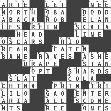 ACROSS 1. Johnson of "Laugh-In" 5. Allow 8. Born 11. 0 degrees 13. Chief or king in Benin or Nigeria 14. Texas town _ City 15. Phillipine bananalike plant 16. Director Reiner 17. Liveliness 18. French article 19. It's straight from the horse's mouth 21. Any of the three canals of the cochlea 22. Froth on beer 24. Actor's bit 25. Motion picture awards 27. River (Sp.) 29. Bring up, as a child 30. Consumed 32. Object of repulsion 33. All-night dance parties 35. American tennis player Robert 39. Window treatment 41. Comedian Laurel of Laurel & Hardy 42. Choose 43. Broken pieces 45. Narrow board 48. Root beer relative 49. Large country 50. Demure 52. Three (prefix) 55. _ and Stitch 56. E Mali city 57. Keyboard key 59. Roberta Peters solo 60. Everything 61. Biscuitlike quick bread 62. Mountains (abbr.) 63. To sift 64. Singles DOWN 1. Of or related to the anus 2. Loose flowing garment 3. File 13 4. And so on (abbr.) 5. Australian parrot (variant) 6. Inky black, to poets 7. Keyboard key 8. Pitcher Ryan 9. Peak District village in England 10. Pulitzer Prize-winning author Ferber 12. Ethiopian city, capital of Harari 14. Tenth: prefix 20. Begley and Asner 21. _ gin 23. Having ears or earlike features 25. Globe 26. Ocean 27. Actress Charlotte 28. It is 30. Night before a holiday 31. Rhinal 33. Reproach for some lapse or misdeed 34. Fitting 36. Ski resort town in Vermont 37. Possessed 38. Followers of ems 40. Roll call or roster of names 43. _-fi 44. Dwellings 45. Chest covering 46. Ms. Damita and namesakes 47. Small Philippine buffalo 49. Burrowing marine mollusk 50. Diluted with white 51. Hero or heavy, e.g. 53. French philosopher Descartes 54. Angers 56. Slender fish 58. Non-commissioned officer (abbr.)