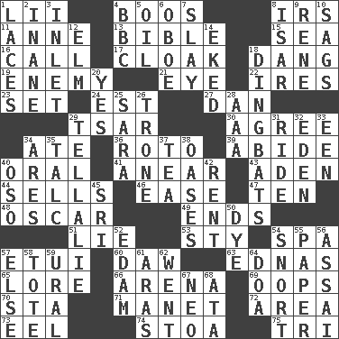 ACROSS 1. Cards in a Roman deck? 4. Scornful sounds 8. Big collection agency 11. Queen of England 1702-14 13. God's Word 15. Ocean 16. Give a ring to 17. Hide under a false appearance 18. Mild oath, euphamism for damn 19. Foe 21. Sight organ 22. Angers 23. Arrange properly for use 24. Eastern Standard Time (abbr.) 27. Daniel's nick name 29. Russian ruler of old 30. Match 34. Had dinner 36. Printing process, for short 39. Remain 40. Spoken 41. Approach 43. An important port of Yemen 44. Exchanges for money 46. Relaxation 47. "___ Little Indians" 48. Witty Wilde 49. Extremities 51. Untruth 53. Filthy place 54. Health resort 57. Needle holder 60. Fool 63. Ferber et al. 65. Old wives' tales, e.g. 66. Sports stadium 69. I made a mistake 70. R.R. building 71. French painter Edouard 72. Length times width 73. Snakelike fish 74. Portico 75. Three (prefix) DOWN 1. Shoestrings 2. Lacking in sense or substance 3. An arm off of a larger body of water 4. English channel? 5. Lubricate 6. Mitch Miller's instrument 7. Kill 8. Austrian river, tributary to the Danube 9. French philosopher Descartes 10. Settles 12. Shade tree 14. Supplemented with great effort 18. Empty-headed or silly people 20. It is so 25. "Two Mules for Sister ____" 26. Marketplace scale 28. Auto club (abbr.) 29. Copy Pinocchio 31. Travel on an animal 32. Genesis locale 33. Car or cant ending 34. Ancient Greek god of war 35. Baby powder 37. Afternoon social gathering 38. Fertile tracts in a desert 40. Bear (Spanish) 42. Monthly bill 45. Indian title of respect (Mr.) 50. Color 52. Dutch treat 54. Derisive sound 55. Some stationery 56. Slender Brazilian palm 57. Otherwise 58. Lug 59. Mountain range 61. Ancient river in northeast Turkey 62. Gone 64. ___ good deed 67. Modern: prefix 68. "One Day ___ Time"