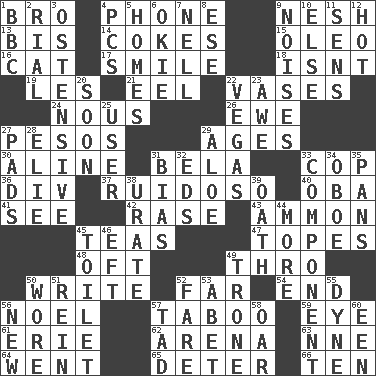 ACROSS 1. Sis' sibling 4. Give a jingle 9. Tender 13. Twice 14. Popular sodas 15. Margarine 16. Domesticated feline 17. Grin 18. Is not 19. French article 21. Snakelike fish 22. Flower holders 24. Horse sense 26. She-sheep 27. Mexican monetary units 29. Grows older 30. Place in a line 31. Actor Lugosi 33. Police officer (slang) 36. HTML Container Element 37. Boisterous (Brazilian Portuguese) 40. Chief or king in Benin or Nigeria 41. Observe 42. Raze (variant) 43. ID or VA city 45. Beverages made from leaves 47. Drinks excessively 48. Often (poetically) 49. Through, poetically 50. Compose 52. Distant 54. Conclude 56. Christmas carol 57. Off limits 59. Sight organ 61. One of the Great Lakes 62. Sports stadium 63. Compass dir. 64. Gone 65. Prevent from occurring 66. Nine, plus one DOWN 1. English channel? 2. Monetary unit of Yemen 3. Clearly or manifestly demonstrative 4. Personal Computers (abbr.) 5. Residences 6. Migrant worker of the '30s 7. 1994 drama film starring Jodie Foster 8. Compass dir. 9. Annoying sounds 10. Otherwise 11. Elected reps. 12. Being at a high temperature 20. Within a short period 22. Viva Las _ 23. Deep reverence 25. One who uses or employs something 27. Groovy apts. 28. Writer Wiesel 29. Medicinal plant 31. Prejudice 32. Begley and Asner 33. Part 34. Mitch Miller's instrument 35. Zero-star reviews 38. A salt of uric acid 39. Pledge 44. Greater amount 45. Bathroom 46. Lizard (obsolete) 49. Marketplace scale 50. Had on 51. It's straight from the horse's mouth 52. Conductor's collection 53. Collude with 55. Centimeter-gram-second unit of force 56. ___ Haven, CT 57. Small amount or degree 58. Rowing implement 60. Car or cant ending