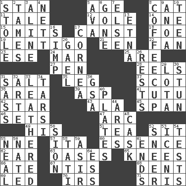 ACROSS 1. Comedian Laurel of Laurel & Hardy 5. Ripen 8. Domesticated feline 11. Falsehood 12. Grand slam 14. Single 15. Leaves out 17. 2nd pers. sing. pres. of can (arch.) 18. Enemy 19. Small, flat, pigmented spot on the skin 21. Car or cant ending 22. Avid follower 23. Compass dir. 24. Make imperfect 25. "We ___ not amused" (Victoria) 27. Animal enclosure 28. Snakelike fish 31. Table seasoning 35. Part of a journey 37. Highlander 38. Type of rug 39. Viper 41. Ballerina skirt 42. Play the lead 43. According to 45. Connect, as a bridge 46. Arranges properly for use 47. Curve 49. Part of HMS, perhaps 51. Beverage made from leaves 52. Be seated 55. Compass dir. 57. Call ___ day 60. Core 62. Hearing organ 63. Fertile tracts in a desert 65. Leg joints 66. Had dinner 67. Nuclear Threat Initiatives 68. Gouge 69. Directed 70. Big collection agency 71. Indian titles of respect DOWN 1. Fur scarf 2. Domesticates 3. Place in a line 4. Remaining after all deductions 5. Actress Gardner 6. Went 7. Otherwise 8. Java holder (2 wds.) 9. Small Philippine buffalo 10. Adolescent 13. Inactive volcano in Sicily 16. Simple or foolish person 17. Pupil covering 20. Highlander 26. Musical pauses 29. Globular water bottle used in Asia 30. Surprise greatly 31. Backtalk 32. Johnson of "Laugh-In" 33. Tough but pliablecoriaceous 34. Tarsus (plural) 36. Girls' org. (abbr.) 40. Food holders 44. Ancient Greek god of war 48. Keg 50. The Jewish people; Israel 52. Scornful expression 53. Ancient Celtic tribe of eastern Britain 54. Trials 55. Actress Patricia 56. Nathan's nickname 58. Jacques of French films 59. SW Saudi Arabia district 61. Extremities 64. Double-curved letter