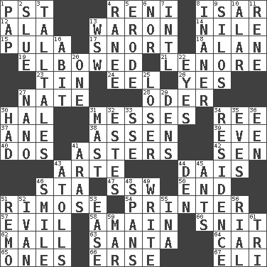 ACROSS 1. Pacific Standard Time (abbr.) 4. Painter Guido (1575-1642) 8. Austrian river, tributary to the Danube 12. In the manner of 13. Make _____ (do battle with) 14. "Death on the ____" 15. Monetary unit of Botswana 17. Derisive sound 18. Actor Alda or Thicke 19. Shoved, as through a crowd 21. Poe poem 23. Shallow baking pan 24. Snakelike fish 26. Affirmative reply 27. Nathan's nickname 28. River in Europe 30. Actor Linden 31. Makes clutter 34. To riddle 37. One (Scot) 38. NE Netherlands city 39. Night before a holiday 40. Two (Sp.) 41. Michaelmas daisies 42. Elected rep. 43. Johnson of "Laugh-In" 44. Raised platform 46. R.R. building 47. Compass dir. 50. Conclusion 51. Full of chinks, cracks, or crevices 54. Hard copy producer 57. Tending to cause great harm 58. At full speed 60. In a ____ (agitated or irritated) 62. Shopping center 63. Before Barbara or Clara 64. Auto 65. Singles 66. Celtic language 67. Biblical high priest DOWN 1. Infant food 2. Change direction abruptly 3. Baron Munchausen's specialties 4. The wife of a rajah (variant) 5. Eat (away) 6. And not 7. International (abbr.) 8. More lacking in sense or substance 9. Grain storage towers 10. Having or resembling wings 11. French philosopher Descartes 13. Compass dir. 16. "This won't hurt ____!" 20. Single 22. Sight organs 25. Failure 27. Billionth: prefix 29. Hiding places for outlaws 30. Possessed 31. Vertical spar for supporting sails 32. _____ Park, CO 33. Compass dir. 34. Dwelling 35. Nights before holidays 36. Car or cant ending 41. Ancient river in northeast Turkey 43. Ringlike coral islands and reefs 44. Lair 45. Pismires 46. Grin 48. Connects, as a bridge 49. Compose 51. San ____ (Riviera town) 52. "Terrible" tsar 53. Comfort 55. _ tizzy (2 wds.) 56. Monetary unit of Yemen 59. Third mo. 61. Three (prefix)