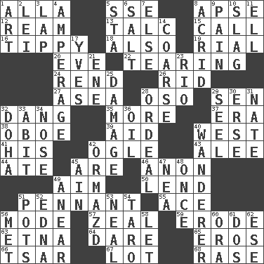 ACROSS 1. Silent film actress Nazimova 5. Compass dir. 8. Domed church section 12. 480, 500 or 516 sheets of paper 13. Baby powder 15. Give a ring to 16. Likely to tip or tilt 18. In addition 19. Monetary unit of Yemen 20. Night before a holiday 22. Separating forcefully 24. Tear apart 26. To free from 27. Toward the sea 28. Bear (Spanish) 29. Elected rep. 32. Mild oath, euphamism for damn 35. Greater amount 37. Period 38. Mitch Miller's instrument 39. Help 40. Compass direction 41. Part of HMS, perhaps 42. Stare at amorously 43. Toward shelter 44. Had dinner 45. "We ___ not amused" (Victoria) 46. Soon (poet.) 49. Direct toward a target or goal 50. Grant temporary use of 51. Pre-World Series prize 55. Adept person 56. Method 57. Ardor 59. Wear away 63. Inactive volcano in Sicily 64. Have the gumption 65. Greek god of love 66. Russian ruler of old 67. Car dealer's back yard 68. To erase DOWN 1. Tate display 2. Flowery wreath 3. Infant locale 4. Electrical Measurement 5. R.R. building 6. Table seasoning 7. Otherwise 8. Bitter 9. Ache 10. Volcanic refuse 11. Pipe bend 14. Rough 17. Jacques Cousteau's middle name 21. Compass dir. 23. River (Sp.) 25. Break 28. Severe or trying experience 29. Sew up the eyelids of hawks and falcons 30. Celtic language 31. Nathan's nickname 32. Capital of the state of Qatar 33. "This won't hurt ____!" 34. Sense of smell 36. Lubricate 40. Roamer 42. Chief deity of Zoroastrianism 45. The 18th letter of the Arabic alphabet 47. Teachers' org. 48. At one time in the past 49. Approach 51. Plant holders 52. Pulitzer Prize-winning author Ferber 53. Be tempered by heat 54. Edible starchy tuberous root 56. Was introduced to 58. Allow 60. Mouth or opening 61. Two (Sp.) 62. Compass dir.
