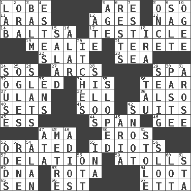 ACROSS 1. Ear part 5. "We ___ not amused" (Victoria) 8. Bear (Spanish) 11. Ancient river in northeast Turkey 12. Matures 13. Tired old horse 14. Greek mezzo-soprano Agnes 17. A testis 19. Ear of corn 21. Cigar-shaped 22. Narrow board 23. Ocean 24. Mayday 27. Curves 29. Health resort 32. Stared at amorously 34. Part of HMS, perhaps 36. Rend 37. ____ Bator, Mongolia 38. Pipe bend 39. In addition 40. Puts into a specified state 41. "Barney Miller" actor Jack 42. Costumes for special activities 43. Curvy letter 44. Connect, as a bridge 46. Turn to the right 47. Nursemaid (var.) 50. Greek god of love 52. Spoke pompously 55. Foolish or stupid persons 57. Accusation by an informer 59. Ringlike coral islands and reefs 62. Heredity factor (abbr.) 63. Round or rotation of duties 64. Spoils 65. Elected rep. 66. Eastern Standard Time (abbr.) 67. Singer James DOWN 1. Experiment locale 2. Mouth or opening 3. Lip ointment 4. _____ Park, CO 5. Personal question 6. Musical pauses 7. First name in cosmetics 8. Single time 9. Table seasoning 10. Double curve, resembling the letter S 12. Had dinner 15. First course 16. Having or resembling wings 18. Lyricist Gershwin 20. Strong, restless desires 24. Lush 25. Stares 26. Narrow boards 28. Grain storage towers 29. Major League Baseball Commissioner Bud 30. Thick mixture 31. Came up 33. Followers of ems 35. Had an oblique or slanted direction 36. The 19th letter of the Greek alphabet 42. Snout, nose 45. Operatic vocal solo 47. _ moment's notice (2 wds.) 48. Distance measurement (Brit.) 49. Goodbye (Sp.) 51. Took without asking 52. Likelihood 53. French philosopher Descartes 54. Actor Alda or Thicke 55. _ tizzy (2 wds.) 56. Groove 58. Baseball player Mel 60. Car dealer's back yard 61. R.R. building