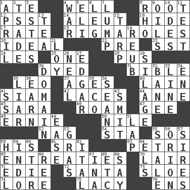 ACROSS 1. Had dinner 4. Water source 8. Carrot, for example 12. Inconspicuous attention getter 14. Eskimo relative 16. Flintstone garb 17. Pace 18. Complicated, petty procedures 20. Standard of perfection 22. Before (prefix) 23. Fast jet (abbr.) 24. French article 25. Single 28. Ichor 30. Colored 31. Instruction Manual for Humans 35. Lion 37. Grows older 40. (Had) reclined 41. Thailand, formerly 42. Shoestrings 44. Queen of England 1702-14 45. "Two Mules for Sister ____" 46. Wander 47. Unit of force equal to gravity 48. Bert's buddy 50. The longest river in the world 52. Tired old horse 54. R.R. building 55. Mayday 58. Part of HMS, perhaps 61. _ Lanka 63. _ dish (used to culture cells) 65. Pleas 70. Den 71. Singer Brickell 72. Before Barbara or Clara 73. _ gin 74. Old wives' tales, e.g. 75. Made of lace 76. Followers of ems DOWN 1. Showery time 2. Sadhe (variant) 3. _____ Park, CO 4. Armed conflict 5. Connecticut Ivy Leaguer 6. Part of a journey 7. Mass 8. 17th letter of the Greek alphabet 9. Petroleums 10. Lyric poems 11. Trial 13. Afternoon social gathering 15. Canvas cover 19. Reuben's nickname 21. Myrna of the movies 26. Actress Patricia 27. _ Allan Poe 29. Fodder prepared in a silo 30. Kingdom 32. Object of repulsion 33. Actor's bit 34. Compass dir. 35. One who doesn't tell the truth 36. Merit 38. Environmental prefix 39. Seines 41. Compass dir. 43. Stricken, poetically 49. Relaxation 51. Infant locale 53. Pate de foie ____ 55. Showing deterioration from age 56. Constellation of myth 57. Begets 58. Person who is morally reprehensible 59. Southeast Asian peninsula 60. Move through with a circular motion 62. Slanted text style (abbr.) 64. Raised railways 66. Portuguese money of account (variant) 67. _ tizzy (2 wds.) 68. And so on (abbr.) 69. Declare