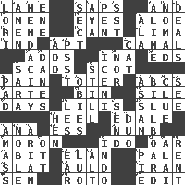 ACROSS 1. Unable to walk 5. Plant excrements 9. Plus 12. Presage 13. Nights before holidays 14. Medicinal plant 15. French philosopher Descartes 16. Patter 17. Pale green bean 18. Indiana (abbr.) 19. Fitting 21. Lessep's creation 22. Sums up 24. _ tizzy (2 wds.) 26. Begley and Asner 27. Loads 28. Highlander 29. Ache 30. Carrier 32. Lettered men learn these first 36. Johnson of "Laugh-In" 37. Storage container 38. Drop; flow; fall 39. 24-hour periods 40. Ms. Damita and namesakes 42. Change direction abruptly 43. The bottom of a shoe or boot 44. Peak District village in England 46. Santa ___, CA 49. Double-curved letter 50. Unfeeling 51. Person of subnormal intelligence 53. Wedding promise 54. Rowing implement 57. "This won't hurt ____!" 58. Style 61. Diluted with white 62. Narrow board 63. Old (Scot.) 64. SW Asia republic 65. Elected rep. 66. Printing process, for short 67. Prepare for publication DOWN 1. Australian parrot (variant) 2. So be it 3. Ananias' fault 4. Compass dir. 5. Religious group 6. Actress Gardner 7. Writing instrument 8. Fast jet (abbr.) 9. Place in a line 10. Roamer 11. Allots cards 14. Chicken ___ king 19. Say or write further 20. Inconspicuous attention getter 21. Domesticated feline 23. Natives or inhabitants of Denmark 24. Ancient Celtic tribe of eastern Britain 25. Not either 27. "Two Mules for Sister ____" 28. Free of sound 29. Writing tablet 31. Off-Broadway awards 32. Indian state 33. Big road sign 34. A slight indication 35. Perceive with the eye 40. French article 41. Transmit 43. Layer 45. Superhero pair 46. Collect or gather 47. Impressive in appearance 48. Believer in; advocate of (suffix) 52. Baseball player Mel 53. Southeast Asian peninsula 55. Jai ____ 56. Monthly bill 58. Hearing organ 59. Nilotic language 60. Keyboard modifier key 61. Sliced dessert