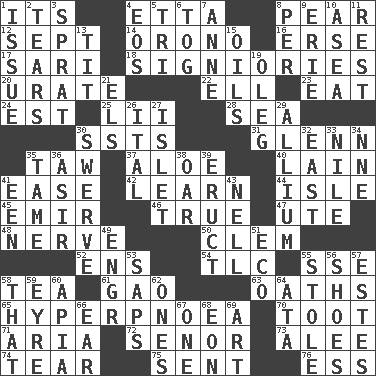 ACROSS 1. It is 4. Singer James 8. Lightbulb-shaped fruit 12. Back-to-school mo. 14. U. of Maine site 16. Celtic language 17. Indian skirt 18. Seigniories (variant) 20. A salt of uric acid 22. Pipe bend 23. Ingest 24. Eastern Standard Time (abbr.) 25. Cards in a Roman deck? 28. Ocean 30. Fast planes 31. American astronaut and politician John 35. The 23rd letter of the Hebrew alphabet 37. Medicinal plant 40. (Had) reclined 41. Comfort 42. Acquire or gain knowledge or skills 44. Small island 45. Independent ruler or chieftain 46. Loyal 47. Shoshoni 48. Impudent aggressiveness 50. To starve (Brit.) 52. Followers of ems 54. Affectionate concern, for short 55. Compass dir. 58. Afternoon social gathering 61. E Mali city 63. Profane or obscene expressions 65. Abnormally rapid or deep breathing 70. A blast of a horn 71. Roberta Peters solo 72. Sir (Sp.) 73. Toward shelter 74. Pull apart 75. Posted 76. Double-curved letter DOWN 1. Come out of 2. Lacerates 3. Small fatty European fish 4. Greek goddess of the dawn 5. Three (prefix) 6. Coat; cloak 7. Singer Murray 8. For each 9. 4th largest of the Great Lakes 10. At sea 11. Respite 13. Teat (slang) 15. Lubricates 19. Cassini of fashion 21. Raised railways 26. Slanted text style (abbr.) 27. Small island 29. Plant genus of onion and garlic 30. Turn aside suddenly 32. 90 degrees 33. "Death on the ____" 34. Compass dir. 35. Docile 36. SW Saudi Arabia district 38. Boat paddle 39. Spew [out] 41. Car or cant ending 43. 1994 drama film starring Jodie Foster 49. Engineer (abbr.) 51. Environmental prefix 53. Plant excrements 55. Fur scarf 56. Imelda's hoard 57. _____ Park, CO 58. Not this but _ 59. Jane of fiction 60. Capital of Western Samoa 62. Washington bills 64. "One Day ___ Time" 66. Ewer handle 67. Single 68. Age 69. Nonscientific branch of learning