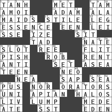 ACROSS 1. Hyperbolic tangent 5. Was introduced to 8. Scottish cap 11. Mine, in Marseilles 12. First man 14. In the manner of 15. Unmarried girls 17. Vertical member of a panel or frame 18. Part of a journey 19. Gist 21. Car or cant ending 22. Luau accessory 23. Compass dir. 24. Ending with capital 25. Be seated 27. Small boy 28. Nathan's nickname 31. Position in a hierarchy or organization 35. To separate or throw off 37. Sudden quick movement 38. Expression of disdain 39. Director Reiner 41. Monthly bill 42. Against 43. Arrange properly for use 45. Toward the sea 46. Adolescent 47. Modern: prefix 49. Teachers' org. 51. Plant excrement 52. Ocean 55. Tenth month of the Hindu calendar 57. And not 60. Speakers 62. Corn or form start 63. Bee-related 65. Rings 66. 54 in ancient Rome 67. Mass 68. Ancient Persian 69. Had dinner 70. Fast jet (abbr.) 71. Paradise DOWN 1. Softens 2. Collect or gather 3. Annoying sound 4. Flintstone garb 5. Floor protector 6. Singer Brickell 7. Story 8. Baron Munchausen's specialties 9. Toward shelter 10. Wise men 13. Not women's 16. In a ____ (agitated or irritated) 17. Sowing specialist 20. Russian ruler of old 26. Kind of red light 29. Prong on a fork 30. Singer James 31. Argument over a trivial matter 32. Actor's bit 33. Clearly or manifestly demonstrative 34. One or ones belonging to thee 36. Greek goddess of the dawn 40. Gillaume's butler role 44. Pull apart 48. Brightly colored fish 50. Of or related to the anus 52. Having a sole or soles 53. Eat (away) 54. NE Netherlands city 55. Monetary unit of Botswana 56. A single undivided whole 58. Musical composition 59. Basketball hoops 61. Docile 64. Fitting
