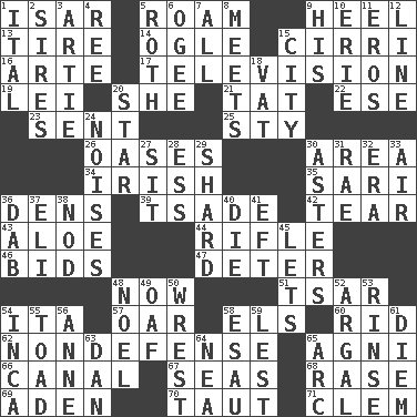 ACROSS 1. Austrian river, tributary to the Danube 5. Wander 9. Person who is morally reprehensible 13. Hoop that covers a wheel 14. Stare 15. High-altitude cloud 16. Johnson of "Laugh-In" 17. Household entertainment appliance 19. Flowery wreath 20. A female animal or person 21. Make lace 22. Compass dir. 23. Posted 25. Filthy place 26. Fertile tracts in a desert 30. Length times width 34. From or relating to Ireland 35. Indian skirt 36. Lairs 39. Sadhe (variant) 42. Rend 43. _ vera 44. Ransack; plunder; pillage 46. Auction offers 47. Prevent from occurring 48. At this time 51. Russian ruler of old 54. Call ___ day 57. Boat paddle 58. Raised railways 60. To free from 62. Unrelated to defense, as in spending 65. Hindu god of fire 66. Lessep's creation 67. Oceans 68. To erase 69. Arabian gulf 70. Drawn tight 71. To starve (Brit.) DOWN 1. Slanted text style (abbr.) 2. Begets 3. Nick name for Arthur 4. To sift 5. Writer of Portnoy's Complaint (1969) 6. Double curve, resembling the letter S 7. 100% 8. Confronts 9. Part of HMS, perhaps 10. One of the Great Lakes 11. Greek god of love 12. Actor's bit 15. Municipality 18. Large container 20. Play the lead 24. Annoying sounds 27. Be seated 28. Double-curved letter 29. Broken piece 30. Michaelmas daisies 31. Actress Charlotte 32. Epoch 33. Atmosphere 36. Pat or tap gently 37. Connecticut Ivy Leaguer 38. Allow head to fall sleepily 40. Pass on 41. Lizard (obsolete) 45. Allows 48. Christmas carol 49. Clumsy lout 50. Obtain by seizing forcibly or violently 52. Therefore, facetiously 53. Remove soap 54. South American Indian 55. Frog relative 56. Singer Murray 58. Son of Isaac 59. For fear that 61. South Vietnam president (1954) 63. One of the 12 tribes of Israel 64. Teachers' org. 65. Curve