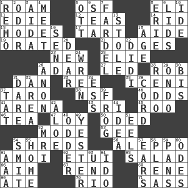 ACROSS 1. Wander 5. Order of Saint Francis (abbr.) 8. Connecticut Ivy Leaguer 11. Singer Brickell 12. Afternoon social gatherings 14. To free from 15. Methods 17. Small pie 18. Helper 19. Declaimed 21. Evades 23. ___ Haven, CT 25. Writer Wiesel 26. The sixth month of the Jewish calendar 27. Directed 28. Director Reiner 31. One of the 12 tribes of Israel 33. To sift 35. Ancient Celtic tribe of eastern Britain 37. Edible starchy tuberous root 38. Science/research agcy. 40. Likelihood 41. Sports stadium 43. _ Lanka 45. Friend of Pooh 46. Afternoon social gathering 47. Myrna of the movies 50. Wrote a lyric poem 52. Method 53. Turn to the right 54. Tears up 56. City in Syria 61. Mine, in Marseilles 62. Needle holder 65. Vegetable dish 66. Direct toward a target or goal 67. Tear apart 68. French philosopher Descartes 69. Had dinner 70. _ de Janeiro 71. Backtalk DOWN 1. San ____ (Riviera town) 2. Scent 3. Opera by Verdi 4. Confront 5. Baseball player Mel 6. Ocean 7. Burden 8. 4th largest of the Great Lakes 9. Flaplike coverings 10. Binary compound 13. Took without asking 16. Post 18. Grow older 20. Letter starter 22. "You Light Up My Life" star Conn 24. Songbird 26. At once, immediately (arch.) 28. Make new 29. Southwest Nigerian state 30. Altar cloth linen 31. Have the gumption 32. Length times width 34. Curvy letter 36. Drawstring 37. Make lace 39. Toadlike animal 42. _ vera 44. The content of cognition 48. More peculiar 49. Last past 51. Snakelike fish 52. Medical imaging device (abbr.) 54. Stricken, poetically 55. Dwelling 57. Hearing organs 58. Entreaty 59. Baking dishes 60. Lyric poems 61. Auto club (abbr.) 63. University (slang) 64. Wedding promise