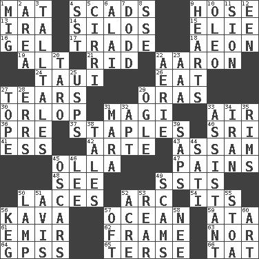 ACROSS 1. Floor protector 4. Heaps 9. Flexible conduit 13. Retirement account (abbr.) 14. Grain storage towers 15. Writer Wiesel 16. Set 17. Barter 18. Age 19. Keyboard modifier key 21. To free from 22. Composer Copland 24. "Change" in Tahitian 26. Consume 27. Pulls into pieces 29. Mouths or openings 30. Lowest deck of a ship 31. Wise men 33. Atmosphere 36. Before (prefix) 37. Paper fasteners 40. Indian title of respect (Mr.) 41. Double-curved letter 42. Johnson of "Laugh-In" 43. Indian state 45. Water jar 47. Aches 48. Perceive with the eye 49. Fast planes 50. Shoestrings 52. Curve 54. It is 56. Polynesian shrub of the pepper family 57. Sea 59. _ moment's notice (2 wds.) 61. Independent ruler or chieftain 62. Movie unit 63. Or not 64. Global Positioning Systems (abbr.) 65. Laconic 66. Make lace DOWN 1. Russian fighter aircraft 2. Length times width 3. Baron Munchausen's specialties 4. Fast jet (abbr.) 5. High-altitude cloud 6. Jai ____ 7. Texas town _ City 8. Compass dir. 9. Centers 10. Butter sub 11. The Jewish people; Israel 12. Car or cant ending 20. Pacific island yam 22. Nest on high 23. American Automobile Association (abbr.) 25. United States Postal Service (abbr.) 27. Drink excessively 28. Blunders 29. Stare at amorously 31. Hindu Mythology: god of death 32. Fitting 33. Helper 34. SW Asia republic 35. Basketball hoops 38. Falsehoods 39. Plant excrements 44. Suttee (variant) 45. Motion picture awards 46. Area sheltered from the wind 49. Fraudulent business schemes 50. Desk light 51. Advice 52. Measure of real estate 53. Tail end 55. Portico 56. Cask 57. Often (poetically) 58. Born 60. Tate display