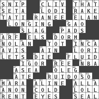 ACROSS 1. Sever or remove by pinching or nipping 5. 154 in Roman numerals 9. Not this but _ 13. Bristle 14. Farming town in central California 15. Libertine 16. Jacques of French films 17. Indian princess (variant) 18. Liveliness 19. Yearning 21. E Mali city 22. Volcanic refuse 23. Writing tablets 24. Sandy's bark 27. Raised railways 28. Dormintory (informal) 29. Pitcher Ryan 31. Small child 32. South American Indian 36. Opinion 37. The 18th letter of the Arabic alphabet 38. Australian parrot (variant) 39. Allows 40. Expire 41. Watery 42. Composer Stravinsky 44. To separate or throw off 46. Basketball assoc. 47. Toward the sea 48. Cassini of fashion 50. Had dinner 51. Boisterous (Brazilian Portuguese) 54. Hindu Mythology: god of death 56. Place in a line 58. Silent film actress Nazimova 60. Soon (poet.) 61. Lacking warmth 62. Hang loosely or laxly 63. Monthly bill 64. Snake ____ (dice throw) 65. Lick closed DOWN 1. Fast jet (abbr.) 2. Actress Patricia 3. "Tell ____ the Marines!" 4. Aches 5. Rings like a ship's bell 6. Yearn 7. Binary compound 8. Compete 9. Excercise machine 10. Auras 11. Alias (abbr.) 12. Nine, plus one 17. Monetary unit of Yemen 20. Small, secluded valley 21. Slender fish 23. Plant holder 24. Of or related to the anus 25. Be footloose 26. Secret move to avoid paying debts 28. Spanish title 30. Aide 31. Make a knot 33. Part of speech 34. Baby bed with high sides 35. Opera by Verdi 37. Wind 40. ___ good deed 41. Nourish 43. Turn to the right 44. Periods in a boxing match 45. Writer Wiesel 47. Composer Copland 49. Finish lines 51. Cause heat under the collar 52. _ gin 53. Spanish pot 54. Make imperfect 55. A saturated hydrocarbon 56. Adept person 57. Myrna of the movies 59. Everything