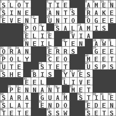ACROSS 1. Slit 5. Make a knot 8. So be it 12. Trig term 13. Pismires 15. Libertine 16. Happening 18. To (old English) 19. Double curve, resembling the letter S 20. Luau course 22. Deli grouping 24. Writer Wiesel 26. By way of 27. Famous astronaut Armstrong 28. Nine, plus one 29. Leather borer 32. NW Algerian seaport 35. Blunders 37. Unit of force equal to gravity 38. More than one (prefix) 39. Corporate head (abbr.) 40. Confront 41. Shoshoni 42. Proofreading order 43. United States Postal Service (abbr.) 44. A female animal or person 45. Altar cloth linen 46. Jacques Cousteau's middle name 49. Snakelike fish 50. Moving, as bait 51. Pre-World Series prize 55. Was introduced to 56. "Two Mules for Sister ____" 57. Island territory of the United States 59. Vertical member of a panel or frame 63. Narrow board 64. Inside; within (prefix) 65. Paradise 66. False hair 67. Compass dir. 68. Puts into a specified state DOWN 1. Compass dir. 2. 54 in ancient Rome 3. Single 4. 3-inch nail 5. The 19th letter of the Greek alphabet 6. Lodging establishments 7. Singer James 8. Scent 9. Wise men 10. Makes supply last 11. Born 14. Finds the solution 17. Lacquered or enameled metalware 21. One more than two 23. The 18th letter of the Arabic alphabet 25. Opts 28. Trinitrotoluene 29. Eras 30. Shed a tear 31. Allows 32. Musical composition 33. Writer of Portnoy's Complaint (1969) 34. Toward shelter 36. To separate or throw off 40. French bagpipes 42. Fodder prepared in a silo 45. Benjamin's nick name 47. Zeal 48. Nights before holidays 49. Maternal 51. Diluted with white 52. Part of Q.E.F. 53. Religious women 54. Small amounts or degrees 56. Fast jet (abbr.) 58. Cut the grass 60. Binary compound 61. Allow 62. Followers of ems