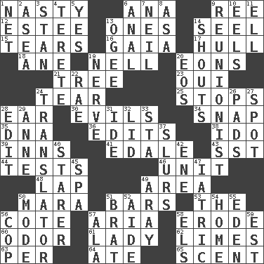 ACROSS 1. Characterized by obscenity 6. Santa ___, CA 9. To riddle 12. First name in cosmetics 13. Singles 14. Stitch closed the eyes of (a falcon) 15. Pulls into pieces 16. Greek goddess of the earth (variant) 17. Frame or body of a ship 18. One (Scot) 19. 1994 drama film starring Jodie Foster 20. Immeasurably long periods of time 21. Relationship diagram 23. Fr. "Yes" 24. Rend 25. Halts 28. Ewer handle 30. Vices 34. Fastener 35. Heredity factor (abbr.) 36. Prepares for publication 38. Wedding promise 39. Lodging establishments 41. Peak District village in England 43. Fast jet (abbr.) 44. Trials 46. A single undivided whole 48. Infant locale 49. Length times width 50. Hindu Mythology: god of death 51. Drinking establishments 53. Definite Article 56. ____ d'Azur (French Riviera) 57. Roberta Peters solo 58. Wear away 60. Aroma 61. Kenny Rogers chart-topper in '80 62. Citrus fruits 63. For each 64. Had dinner 65. Aroma DOWN 1. Fish or hair follower 2. At sea 3. Comedian Laurel of Laurel & Hardy 4. Cigar-shaped 5. It is so 6. Of or related to the anus 7. Famous astronaut Armstrong 8. White ___ sheet 9. One who advocates reunion 10. Snakelike fish 11. Pipe bend 13. Double curve, resembling the letter S 14. Yells 19. Boldness 20. Greek goddess of the dawn 22. Actress Charlotte 24. Interpreter 26. Writing tablets 27. Blemish 28. Prepare for publication 29. Singer Murray 31. Binary compound 32. Hat (slang) 33. R.R. building 37. Plays smoothly or legato 40. A viewer who gazes fixedly 42. Compass dir. 45. Health resort 47. Of or pertaining to medicine 49. Like ___ of sunshine 50. Method 51. Naughty child 52. Helper 54. Dwelling 55. Locale of original sin 56. Police officer (slang) 57. Chicken ___ king 58. Raised railways 59. Eastern Standard Time (abbr.)