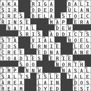 ACROSS 1. Alias (abbr.) 4. Port city in Latvia 8. Indonesian resort city 12. Title for a knight 13. Wrote a lyric poem 14. ____ Bator 15. Angers 17. Actor Lugosi 18. Unemotional 19. Wash lightly 21. Atlas unit 23. Period 24. Relating to or accompanying birth 26. Morning condensation 28. Indian titles of respect 30. Inveterate users 34. R.R. building 37. Small bottle 39. Christmas carol 40. Greek goddess of the dawn 41. Bert's buddy 43. Lion 44. Algonquian 46. Pulitzer Prize-winning author Ferber 47. One (Scot) 48. Sycophants 51. 4th largest of the Great Lakes 54. "Barney Miller" actor Jack 55. Compass direction 58. Naughty child 61. Compass dir. 63. Relating to the nose 65. Table seasonings 67. Capri or Wight 71. Falsehood 72. Type of rug 73. (Had) reclined 74. Two (Sp.) 75. 480, 500 or 516 sheets of paper 76. Colored 77. Eastern Standard Time (abbr.) DOWN 1. SW Saudi Arabia district 2. Japanese brewing company 3. Sports stadium 4. Director Reiner 5. Binary compound 6. Set 7. First man 8. Yet 9. Medicinal plant 10. Den 11. South American Indian 16. Fast planes 18. Broke a traffic law 20. Ewer handle 22. Say or write further 25. Not recorded 27. Victory 29. Male parents of animals 30. Place in a line 31. Root beer relative 32. Adolescent 33. A type of plum 34. Religious group 35. "Corrida" creature 36. At sea 38. Plus 42. Merit 45. Begley and Asner 49. Charged atoms 50. A really long time 52. Electrically charged atom 53. Part of Q.E.F. 56. Sadhe (variant) 57. Saint headwear 58. Austrian river, tributary to the Danube 59. Female horse 60. Entreaty 62. Rampant 64. For fear that 66. Scottish cap 68. Declare 69. Falsehood 70. Conclusion