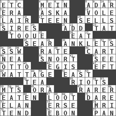 ACROSS 1. And so on (abbr.) 4. Count _ (2 wds.) 8. The sixth month of the Jewish calendar 12. Period 13. "____ silly question..." 14. Grand slam 15. Den 17. Adolescent 18. Makes a sale 19. Male parents of animals 21. Increase 23. Make lace 24. Woman's close-fitting hat 26. Consume 28. Shrivel 30. Short socks 34. Compass dir. 37. Pace 39. Haul 40. Teachers' org. 41. Derisive sound 43. Perceive with the eye 44. "Beetle Bailey" pooch 46. The front part of a cuirass 47. Bank Draft (abbr.) 48. Electrical Measurement 51. Compass direction 54. Beverage made from leaves 55. Debaucheries 58. Mountains (abbr.) 61. Mouth or opening 63. Less widely known 65. Consumed 67. Spoils 71. Have the gumption 72. Flair 73. Celtic language 74. Medical imaging device (abbr.) 75. Be inclined (to) 76. Inky black, to poets 77. Baking dish DOWN 1. Snakelike fish 2. Distinguishing feature 3. Capital of Egypt 4. Floor protector 5. Compass dir. 6. D.D.E's nickname 7. Grandmother 8. "___ Maria" 9. Stupid person 10. Silent film actress Nazimova 11. Relief 16. Vintage cars 18. Neighbor of Neb. 20. Institute legal proceedings 22. Lair 25. Hearing organs 27. Affectionate concern, for short 29. The wife of a rajah (variant) 30. Nest on high 31. Comfort 32. Unclean, religiously 33. Proofreading order 34. Frozen precipitation 35. Bristle 36. Electrical Unit 38. Coat; cloak 42. Russian ruler of old 45. Baseball player Mel 49. A really long time 50. Slender fish 52. Title for a knight 53. Frog relative 56. _____ steamer (cargo ship) 57. Father Junipero _ 58. Confront 59. Story 60. Comedian Laurel of Laurel & Hardy 62. Toward shelter 64. It's straight from the horse's mouth 66. Conclude 68. Globe 69. Bear (Spanish) 70. Nine, plus one