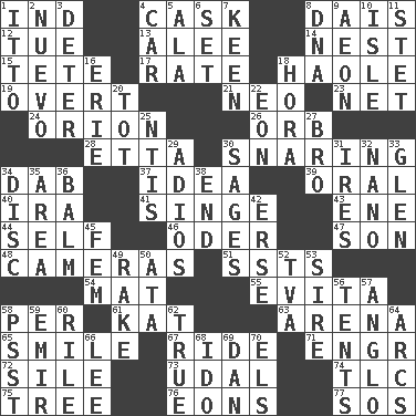 ACROSS 1. Indiana (abbr.) 4. Keg 8. Raised platform 12. Third day of the wk. 13. Toward shelter 14. Egg locale 15. Wig 17. Pace 18. White Person, in Hawaii 19. Unconcealed 21. Modern: prefix 23. Fish or hair follower 24. Constellation of myth 26. Globe 28. Singer James 30. Catching in a trap 34. Small moist lump or mass 37. The content of cognition 39. Spoken 40. Retirement account (abbr.) 41. Scorch 43. Compass dir. 44. Automatic 46. River in Europe 47. Boy, to dad 48. Devices for capturing images 51. Fast planes 54. Floor covering 55. Webber/Rice musical 58. For each 61. Krazy ___ of comics 63. Sports stadium 65. Grin 67. Travel on or in a vehicle 71. Engineer (abbr.) 72. Filth; sediment 73. Allodial 74. Affectionate concern, for short 75. Woody plant 76. Immeasurably long periods of time 77. Mayday DOWN 1. "Tell ____ the Marines!" 2. New (sp.) 3. Prevent from occurring 4. Automobile 5. Wing 6. Arrange properly for use 7. Peachy ____! 8. Heredity factor (abbr.) 9. Age 10. Capri or Wight 11. Proofreading order 16. 4th largest of the Great Lakes 18. Israeli folk dance 20. Small child 22. Age 25. Nuclear Threat Initiatives 27. Sis' sibling 29. Goodbye (Sp.) 30. Gurus 31. Angers 32. Billionth: prefix 33. Small, secluded valley 34. Compact _ 35. Length times width 36. Lip ointment 38. Conclude 42. Celtic language 45. Opposite of masc. 49. Libertine 50. _ moment's notice (2 wds.) 52. Federal power corp. 53. Title for a man of rank and authority 56. Portable shelters 57. White American of non-Hispanic descent 58. Inconspicuous attention getter 59. Arab leader 60. Cause heat under the collar 62. Loyal 64. Curves 66. Area sheltered from the wind 68. Wedding promise 69. Daniel's nick name 70. Raised railways