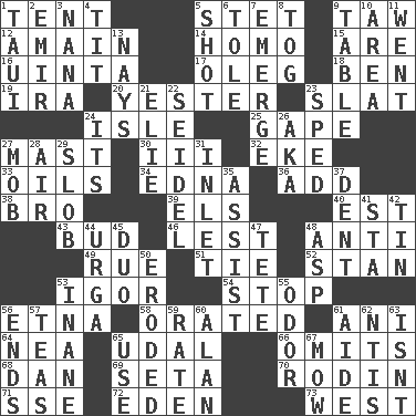 ACROSS 1. Portable shelter 5. Proofreading order 9. The 23rd letter of the Hebrew alphabet 12. At full speed 14. Same (prefix) 15. "We ___ not amused" (Victoria) 16. National forest in Provo, Utah 17. Cassini of fashion 18. Benjamin's nick name 19. Lyricist Gershwin 20. Last 23. Narrow board 24. Capri or Wight 25. Open wide 27. Vertical spar for supporting sails 30. One more than two 32. Supplement with great effort 33. Lubricates 34. Pulitzer Prize-winning author Ferber 36. Increase 38. Sis' sibling 39. Raised railways 40. Eastern Standard Time (abbr.) 43. Partially opened flower 46. For fear that 48. Opposed to 49. Regret 51. Neckwear 52. Comedian Laurel of Laurel & Hardy 53. Russian composer Stravinsky 54. Close up, plug up 56. Inactive volcano in Sicily 58. Declaimed 61. Cuckoo 64. Teachers' org. 65. Hereditary estate 66. Leaves out 68. Daniel's nick name 69. Bristle 70. "The Thinker" sculptor 71. Compass dir. 72. Genesis locale 73. Compass direction DOWN 1. "Change" in Tahitian 2. Arab leader 3. Nanny 4. Teat (slang) 5. Guess 6. Lacquered or enameled metalware 7. Develop 8. Coat; cloak 9. Eating place 10. Length times width 11. Gone 13. Negative votes 21. Writer Wiesel 22. A glass for beer 23. Hurried 24. ___ a Wonderful Life 26. Alias (abbr.) 27. Crowd into 28. Wind 29. Oscar Madison type 31. An arm off of a larger body of water 35. Help 37. Gouge 41. R.R. building 42. Metal container 44. Capital and largest city of Mongolia 45. Superhero pair 47. False hair 48. Viper 50. Eaten away 53. Lacking in sense or substance 55. Scent 56. Conclusions 57. Beverages made from leaves 59. Assign a rank or rating to 60. Actor Alda or Thicke 61. Helper 62. Nuclear Threat Initiatives 63. Is not 65. Purpose 67. Cut the grass