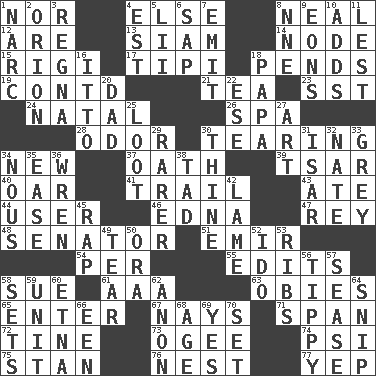 ACROSS 1. Not either 4. Otherwise 8. Be tempered by heat 12. "We ___ not amused" (Victoria) 13. Thailand, formerly 14. Thickened enlargement 15. Swiss mountan, "Queen of the Mountains" 17. Native american tent (variation) 18. Hangs 19. Continued (abbr.) 21. Afternoon social gathering 23. Fast jet (abbr.) 24. Brizilian seaport 26. Health resort 28. Aroma 30. Separating forcefully 34. ___ Haven, CT 37. Pledge 39. Russian ruler of old 40. Boat paddle 41. Lag or linger behind 43. Had dinner 44. One who makes use of a thing 46. Pulitzer Prize-winning author Ferber 47. Marina Del _, California 48. Elected representative 51. Independent ruler or chieftain 54. For each 55. Prepares for publication 58. Take to court 61. Auto club (abbr.) 63. Off-Broadway awards 65. Keyboard key 67. Negative votes 71. Connect, as a bridge 72. Prong on a fork 73. Double curve, resembling the letter S 74. 23rd letter of the Greek alphabet 75. Comedian Laurel of Laurel & Hardy 76. A home for chicks 77. Slangy assent DOWN 1. Drug cop 2. Greek mythologigal hunter 3. Canadian anthropologist Darnell 4. Eastern Standard Time (abbr.) 5. Cards in a Roman deck? 6. Plant excrement 7. Send forth 8. Compass dir. 9. Immeasurably long periods of time 10. Sums up 11. For fear that 16. "Tell ____ the Marines!" 18. Dad 20. June honoree 22. Compass dir. 25. Spoils 27. Nonscientific branch of learning 29. More uncommon 30. One or ones belonging to thee 31. Austrian river, tributary to the Danube 32. Nathan's nickname 33. Jennifer or Joel 34. Horse sense 35. Relaxation 36. Songbird 38. Bit 42. Unable to walk 45. Hit sharply and swiftly 49. Pull into pieces 50. Mouth or opening 52. Wedding promise 53. Chest bones 56. Likely to tip or tilt 57. Gospel singer Marvin 58. Arranges properly for use 59. A single undivided whole 60. Inactive volcano in Sicily 62. At once, immediately (arch.) 64. Sever or remove by pinching or nipping 66. Car or cant ending 68. Grow older 69. Affirmative reply 70. Arrange properly for use