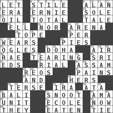 ACROSS 1. Allow 4. Vertical member of a panel or frame 9. ____ Jay Lerner 13. Epoch 14. Bert's buddy 15. Flatfish 16. Petroleum 17. Add up to 18. Story 19. Pipe bend 21. And not 22. Sports stadium 24. Drink excessively 26. For each 27. Erodes 29. Sliced desserts 30. Stares at amorously 31. Capital of the state of Qatar 33. Wind 36. Actress Charlotte 37. Lacerating 40. _ Lanka 41. Begley and Asner 42. Monetary unit of Yemen 43. Indian state 45. Vintage cars 47. Aches 48. Added to 49. Possessive pronoun 50. Laconic 52. Lyricist Gershwin 54. "One Day ___ Time" 56. Indonesian resort city 57. Snout, nose 59. Nanny (var.) 61. A single undivided whole 62. Learning spot: Fr. 63. Immediately 64. Those things 65. Consumed 66. Standoff DOWN 1. Lion 2. 4th largest of the Great Lakes 3. Baron Munchausen's specialties 4. Put into a specified state 5. Marketplace scale 6. To the inside or interior of 7. One who doesn't tell the truth 8. Snakelike fish 9. Michaelmas daisies 10. Grant temporary use of 11. Silent film actress Nazimova 12. Born 20. Old wives' tales, e.g. 22. Bee-related 23. To riddle 25. Inconspicuous attention getter 27. Had on 28. Mild oath 29. Silvers or Donahue 31. Raised platform 32. Mouth or opening 33. Helper 34. SW Asia republic 35. Basketball hoops 38. Eat (away) 39. Yawn 44. "Two Mules for Sister ____" 45. Noteworthy scarcity 46. Followers of ems 49. White Person, in Hawaii 50. Hyperbolic tangent 51. Writer Wiesel 52. South American Indian 53. Carrot, for example 55. Mine, in Marseilles 56. Yet 57. Observe 58. "___ Little Indians" 60. Deep reverence