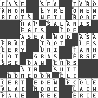 ACROSS 1. Comfort 5. Ocean 8. Edible starchy tuberous root 12. At once, immediately (arch.) 13. Jane of fiction 15. Presage 16. Debaucheries 18. Famous astronaut Armstrong 19. Loose flowing garment 20. Strike 22. Deli grouping 24. Armor plate that protects the chest 26. Binary compound 27. At sea 28. Allow head to fall sleepily 29. White ___ sheet 32. Part of Q.E.F. 35. A blast of a horn 37. French article 38. Suggestive of the supernatural 39. RI univ. 40. Hyperbolic tangent 41. Car dealer's back yard 42. Pate de foie ____ 43. Celtic language 44. Compass dir. 45. One of the 12 tribes of Israel 46. Blunders 49. Atmosphere 50. Costume for a special activity 51. Mood resulting from idleness 55. Biblical high priest 56. Foregone conclusion 57. Genesis locale 59. Learning spot: Fr. 63. Mountain range southwest of Kyrgyzstan 64. Thickened enlargement 65. (Had) reclined 66. Light colored 67. To riddle 68. One of the Great Lakes DOWN 1. Hearing organ 2. Black tropical American cuckoo 3. "Barney Miller" actor Jack 4. Plea 5. Elected rep. 6. Snake ____ (dice throw) 7. Roberta Peters solo 8. Singer Mel 9. Mine, in Marseilles 10. Confederate soldiers (slang) 11. Single 14. American author Paul (1891-1958) 17. Sinks 21. Sliced dessert 23. Find the sum of 25. Titan orbits this 28. Annoying sounds 29. Having or resembling wings 30. Elected reps. 31. American tennis player Robert 32. Snakelike fish 33. Vintage cars 34. Johnson of "Laugh-In" 36. Mouth or opening 40. A testis 42. Place where plants grow 45. Pass on 47. Sorrow 48. Cause heat under the collar 49. Nick name for Arthur 51. Actor Lugosi 52. Taken by mouth 53. Scent 54. Ancient Persian 56. Head covering 58. Born 60. Boat paddle 61. Cards in a Roman deck? 62. Compass dir.