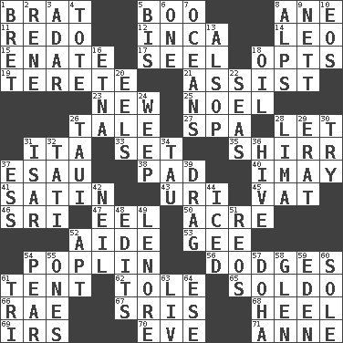 ACROSS 1. Naughty child 5. Oct. 31 cry 8. One (Scot) 11. Make new 12. South American Indian 14. Lion 15. Related on the mother's side 17. Stitch closed the eyes of (a falcon) 18. Chooses 19. Cigar-shaped 21. Help 23. ___ Haven, CT 25. Christmas carol 26. Falsehood 27. Health resort 28. Allow 31. Call ___ day 33. Arrange properly for use 35. Bake eggs in their shells 37. Son of Isaac 38. Groovy apt. 40. "If ____ say so..." 41. Smooth fabric 43. RI univ. 45. Large container 46. _ Lanka 47. Snakelike fish 50. Land measure 52. Assistant 53. Turn to the right 54. Cotton for raincoats, e.g. 56. Evades 61. Portable shelter 62. Lacquered or enameled metalware 65. Twentieth part of a lira 66. Actress Charlotte 67. Indian titles of respect 68. The bottom of a shoe or boot 69. Big collection agency 70. Night before a holiday 71. Singer Murray DOWN 1. Cy Young winner Saberhagen 2. French philosopher Descartes 3. The sixth month of the Jewish calendar 4. Haul 5. Again 6. Single 7. Seas 8. High mountains 9. Remaining after all deductions 10. Greek goddess of the dawn 13. Columnist Joseph or Stewart 16. Inactive volcano in Sicily 18. Petroleum 20. Snakelike fish 22. Oceans 24. Shed a tear 26. "Change" in Tahitian 28. Pale green bean 29. Part of Q.E.F. 30. Attempt to accomplish something 31. Austrian river, tributary to the Danube 32. Jacques of French films 34. The 19th letter of the Greek alphabet 36. Hub of activity 37. Curvy letter 39. To be drawn or hauled along 42. Famous astronaut Armstrong 44. On the rocks 48. Proofreads 49. Poe poem 51. Vintage cars 52. Fitting 54. Lightbulb-shaped fruit 55. Washington bills 57. Capital of the state of Qatar 58. Small, secluded valley 59. Locale of original sin 60. Flatfish 61. Three (prefix) 63. 54 in ancient Rome 64. Compass dir.