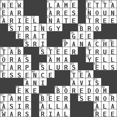 ACROSS 1. ___ Haven, CT 4. Unable to walk 8. Singer James 12. Ewer handle 13. Ancient Greek god of war 14. Part of speech 15. Satellite of Uranus 18. Nathan's nickname 19. Family _ (genealogy) 20. Slender, wiry 22. Sis' sibling 23. Part of Q.E.F. 24. Unit of force equal to gravity 25. Indian title of respect (Mr.) 26. Flamboyance 30. Keyboard key 33. Bull 36. Loyal 37. Mouths or openings 39. Housemaid (var.) 40. Shout 41. Canvas cover 42. Disparaging remarks 44. Raised railways 45. Core 47. Beverage made from leaves 50. Black tropical American cuckoo 51. Deliberation 53. Supplement with great effort 54. Mood resulting from idleness 57. Docile 59. Fermented drink made from hops 61. Sir (Sp.) 63. SW Saudi Arabia district 64. Silent film actress Nazimova 65. Chicken ___ king 66. Armed conflicts 67. Monetary unit of Yemen 68. To sift DOWN 1. Teachers' org. 2. Hearing organs 3. Compose 4. Austrian-born American filmmaker Fritz 5. Like ___ of sunshine 6. Was introduced to 7. Compass dir. 8. Plea 9. "Corrida" creature 10. Third day of the wk. 11. One (Scot) 16. Blunders 17. One who doesn't tell the truth 21. Nuclear Threat Initiatives 22. Benjamin's nick name 24. Slender fish 26. Lightbulb-shaped fruit 27. Algonquian 28. Frame or body of a ship 29. Snakelike fish 30. Lug 31. Ancient river in northeast Turkey 32. Oblong pieces of solid material 34. Story 35. Australian flightless bird 38. Orators 42. _-fi 43. Play the lead 46. Compass dir. 48. Nights before holidays 49. Helper 52. Echolocation 53. Independent ruler or chieftain 54. Actor Lugosi 55. Taken by mouth 56. Undercover agent 57. The 23rd letter of the Hebrew alphabet 58. White ___ sheet 59. Oblong piece of solid material 60. Connecticut Ivy Leaguer 62. Actress Charlotte