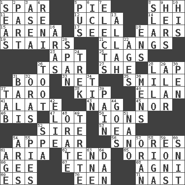 ACROSS 1. Practice fight 5. Sliced dessert 8. Quiet! 11. Relaxation 12. Southern CA. univ. 14. Luau accessory 15. Sports stadium 17. Stitch closed the eyes of (a falcon) 18. Hearing organs 19. Flight of steps 21. Rigngs loudly 23. Fitting 25. Labels 26. Russian ruler of old 27. A female animal or person 28. Infant locale 31. Surprise greeting 33. Fish or hair follower 35. Grin 37. Pacific island yam 38. Monetary unit of Laos 40. Enthusiasm 41. Having winglike extensions 43. Tired old horse 45. Not either 46. Twice 47. Car dealer's back yard 50. Charged particles 52. The founder of a family 53. Teachers' org. 54. Seem 56. Sounds asleep 61. Operatic vocal solo 62. Watch over 65. Greek mythologigal hunter 66. Turn to the right 67. Inactive volcano in Sicily 68. Hindu god of fire 69. Curvy letter 70. Car or cant ending 71. Political cartoonist Thomas DOWN 1. Oceans 2. Component 3. At sea 4. Painter Guido (1575-1642) 5. Ichor 6. Frozen water 7. Chooses 8. Volcanic refuse 9. Possessive pronoun 10. Part of HMS, perhaps 13. Assad's deity 16. Ancient river in northeast Turkey 18. Followers of ems 20. Connect, as a bridge 22. Ripens 24. Long journey 26. A blast of a horn 28. _ and Stitch 29. Having or resembling wings 30. Animal enclosure 31. Indonesian resort city 32. Mouths or openings 34. Shallow baking pan 36. Not women's 37. Keyboard key 39. Ache 42. Writer Wiesel 44. Moves 48. Declaim 49. Cigar-shaped 51. Billionth: prefix 52. Health resort 54. Ancient Greek god of war 55. Sliced desserts 57. NW Algerian seaport 58. Capital of Latvia 59. Immeasurably long periods of time 60. In a ____ (agitated or irritated) 61. Mature 63. Compass dir. 64. One of the 12 tribes of Israel