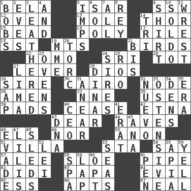ACROSS 1. Actor Lugosi 5. Austrian river, tributary to the Danube 9. Compass dir. 12. Baking chamber 13. Undercover agent 14. Son of Odin 15. Necklace unit 16. Many (prefix) 17. Cause heat under the collar 18. Fast jet (abbr.) 19. Mountains (abbr.) 21. Avian creatures 22. Like (prefix) 24. _ Lanka 26. Small child 27. Prying instrument 28. "Vaya con ____" 29. Title for a man of rank and authority 30. Capital of Egypt 32. Connecting point 36. So be it 37. Compass dir. 38. One who makes use of a thing 39. Writing tablets 40. Desist 42. Inactive volcano in Sicily 43. Letter starter 44. All-night dance parties 46. Raised railways 49. And not 50. At once, immediately (arch.) 51. Country residence 53. R.R. building 54. Declare 57. Toward shelter 58. _ gin 61. Corncob 62. "You Light Up My Life" star Conn 63. Dad 64. Tending to cause great harm 65. Double-curved letter 66. Flats, for short 67. Be tempered by heat DOWN 1. Moves up and down 2. Nights before holidays 3. Tough but pliablecoriaceous 4. Plus 5. Naughty children 6. "Barney Miller" actor Jack 7. 100% 8. Marina Del _, California 9. Upper-body garment 10. Twentieth part of a lira 11. Obtain by seizing forcibly or violently 14. Three (prefix) 19. Madame (abbr.) 20. Torque (variant) 21. Twice 23. Baking chambers 24. Begets 25. Friend of Pooh 27. Pale green bean 28. Middle Eastern gold or silver currency 29. Plant excrement 31. Approach 32. New (sp.) 33. Clearly or manifestly demonstrative 34. Cub Scout units 35. Epoch 40. Corporate head (abbr.) 41. Part of Q.E.F. 43. Heredity factor (abbr.) 45. Santa ___, CA 46. Dodge 47. Ms. Damita and namesakes 48. Bobsleighs 52. Flowery wreath 53. Oceans 55. Capital of Western Samoa 56. Shout 58. Health resort 59. Pet locale 60. Choose 61. Fenced enclosure