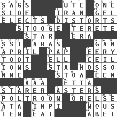 ACROSS 1. Sinks 5. Shoshoni 8. Single 11. _ gin 12. SW Asia republic 13. Set 14. Chooses 17. What propaganda does 19. Moe Howard, for one 21. Cigar-shaped 22. Play the lead 23. Epoch 24. Fast jet (abbr.) 27. Ancient river in northeast Turkey 29. Separate the seeds from cotton 32. Showery time 34. Infant food 36. Suggestive of the supernatural 37. A blast of a horn 38. Pipe bend 39. To provide with a ceiling 40. Charged particles 41. R.R. building 42. With motion or animation 43. Compass dir. 44. Portico 46. Car or cant ending 47. American Automobile Association (abbr.) 50. Singer James 52. A viewer who gazes fixedly 55. Michaelmas daisies 57. Coward 59. Threatening words 62. "One Day ___ Time" 63. Body of Kaffir warriors 64. Good sense 65. "___ Little Indians" 66. Erode 67. Collude with DOWN 1. Compass dir. 2. 100% 3. Travels 4. Religious groups 5. RI univ. 6. Clothes sense 7. Keyboard key 8. Legendary monster 9. Remaining after all deductions 10. Otherwise 12. Binary compound 15. Add up to 16. Fly high 18. Mouth or opening 20. Raisin fruits 24. Smooth fabric 25. Soup utensil 26. Heavy duty weighing machine 28. Table seasonings 29. Honkers 30. Originate 31. High-strength synthetic material 33. It is 35. Food holders 36. Environmental prefix 42. Mother 45. "Beetle Bailey" pooch 47. Nonscientific branch of learning 48. Nest on high 49. Odor 51. Sports stadium 52. Petty quarrel 53. Haul 54. Actor Alda or Thicke 55. Cuckoo 56. Oscar Madison type 58. Elect 60. Take to court 61. Eastern Standard Time (abbr.)