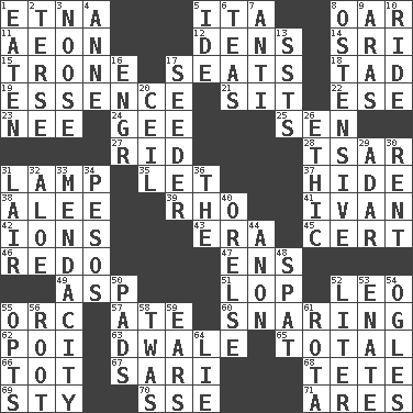 ACROSS 1. Inactive volcano in Sicily 5. Call ___ day 8. Rowing implement 11. Age 12. Habitations of wild animals 14. Indian title of respect (Mr.) 15. Heavy duty weighing machine 17. Theater features 18. Bit 19. Substance 21. Be seated 22. Compass dir. 23. Born 24. Turn to the right 25. Elected rep. 27. To free from 28. Russian ruler of old 31. Desk light 35. Allow 37. Flintstone garb 38. Toward shelter 39. 17th letter of the Greek alphabet 41. "Terrible" tsar 42. Charged atoms 43. Epoch 45. Foregone conclusion 46. Make new 47. Followers of ems 49. Cleo's killer 51. Chop off 52. Lion 55. The grampus (Milton) 57. Had dinner 60. Catching in a trap 62. Luau course 63. A sleeping potion; an opiate (poet.) 65. Add up to 66. Small child 67. Indian skirt 68. Wig 69. Filthy place 70. Compass dir. 71. Ancient Greek god of war DOWN 1. Consumed 2. Laconic 3. Trap for birds or small mammals 4. Queen of England 1702-14 5. Binary compound 6. Afternoon social gatherings 7. Against 8. Clearly or manifestly demonstrative 9. Caspian sea tributary 10. Travel on an animal 13. Fast planes 16. Engineer (abbr.) 17. Sowing specialist 20. To provide with a ceiling 26. Value system 29. The sixth month of the Jewish calendar 30. Monthly bill 31. Den 32. _ vera 33. Ananias' fault 34. Mexican monetary units 36. Definite Article 40. Threatening words 44. At once, immediately (arch.) 48. Petty quarrel 50. Groovy apts. 52. 61 cubic inches 53. Related on the mother's side 54. Stares at amorously 55. Elects 56. Carrot, for example 58. It was, poetically 59. Hearing organs 61. Roll call or roster of names 64. Falsehood