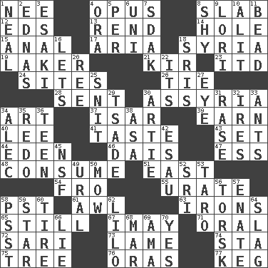 ACROSS 1. Born 4. Musical composition 8. Broad, flat, thick piece 12. Begley and Asner 13. Tear apart 14. Opening into or through something 15. Of or related to the anus 17. Operatic vocal solo 18. Damascus' land 19. Member of a famous L.A. basketball team 21. Apertif with cassis 23. It would 24. Settings 26. Standoff 28. Posted 30. Nineveh was its capital 34. Nonscientific branch of learning 37. Austrian river, tributary to the Danube 39. Merit 40. Area sheltered from the wind 41. Clothes sense 43. Put into a specified state 44. Genesis locale 46. Raised platform 47. Curvy letter 48. Eat 51. 90 degrees 54. Back 55. A salt of uric acid 58. Pacific Standard Time (abbr.) 61. Leather borer 63. Removes the wrinkles 65. Free from disturbance or agitation 67. "If ____ say so..." 71. Taken by mouth 72. Indian skirt 73. Unable to walk 74. R.R. building 75. Family _ (genealogy) 76. Mouths or openings 77. Barrel DOWN 1. Anneal 2. Ferber et al. 3. 1973 Nobel Price Winner (Physics) Leo 4. Mouth or opening 5. For each 6. University (slang) 7. Neighbor of Neb. 8. Like a shrinking violet 9. Australian parrot (variant) 10. Came down and settled, as after flight 11. Necklace unit 16. Allows 18. Indian titles of respect 20. To sift 22. It is 25. In a ____ (agitated or irritated) 27. Sight organ 29. Sadhe (variant) 30. Nick name for Arthur 31. Raze (variant) 32. Angers 33. Pismires 34. Actor Baldwin 35. Make new 36. Adolescent 38. White ___ sheet 42. He sold his birthright 45. Science/research agcy. 49. Mountain range 50. Cut the grass 52. Indian title of respect (Mr.) 53. Pacific island yam 56. Cod relative 57. Related on the mother's side 58. Inconspicuous attention getter 59. Play the lead 60. Become fatigued 62. _ and Stitch 64. Volcanic refuse 66. Falsehood 68. Spoil 69. Wet nurse (var.) 70. Consenting reply