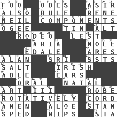 ACROSS 1. Egg _ yung 4. Lyric poems 8. SW Saudi Arabia district 12. In addition 14. Governing power 15. French philosopher Descartes 16. Famous astronaut Armstrong 17. Pieces 20. Double curve, resembling the letter S 21. Shallow baking pan 22. Keyboard modifier key 23. Cowboy competition 27. For fear that 29. Operatic vocal solo 31. Undercover agent 34. Peak District village in England 35. Ancient Greek god of war 36. Actor Alda or Thicke 39. _ Lanka 41. Fast planes 42. Table seasoning 43. From or relating to Ireland 46. Competent 47. Hearing organs 48. Spoken 51. Brizilian seaport 54. Nonscientific branch of learning 56. One more than two 58. Loose flowing garment 61. Rotating or pertaining to rotation 66. Drawstring 67. So be it 68. Medicinal plant 69. Comedian Laurel of Laurel & Hardy 70. Broke a traffic law 71. Cuts off 72. R.R. building DOWN 1. Papal veil 2. Cassini of fashion 3. Flexible twig of a willow tree 4. The grampus (Milton) 5. Superhero pair 6. Shade tree 7. Back-to-school mo. 8. "We ___ not amused" (Victoria) 9. Elected representatives 10. International (abbr.) 11. Repose 13. Butter sub 18. Lubricate 19. Compass dir. 24. June honoree 25. Period 26. Petroleums 28. Box-office sellout 30. Nest on high 32. Allow 33. Double-curved letter 34. Keyboard key 36. White ___ sheet 37. Experiment locale 38. One to whom something is allotted 40. SW Asia republic 44. Lyricist Gershwin 45. Fast jet (abbr.) 49. Small island 50. Cards in a Roman deck? 52. Curves 53. Plunders 54. Caspian sea tributary 55. Play 57. _ the terrible 59. Naughty child 60. Pulitzer Prize-winning author Ferber 62. Plus 63. Biblical high priest 64. Chop off 65. It is so