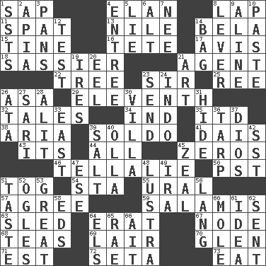 ACROSS 1. Plant excrement 4. Style 8. Infant locale 11. Argument over a trivial matter 13. "Death on the ____" 14. Actor Lugosi 15. Prong on a fork 16. False hair 17. Advice 18. More disrespectful 21. Representative 22. Relationship diagram 23. Title for a knight 25. To sift 26. White ___ sheet 29. Veterans Day date 32. Stories 34. Indiana (abbr.) 35. It would 38. Operatic vocal solo 39. Twentieth part of a lira 41. Raised platform 43. It is 44. Everything 45. Nothings 46. Copy Pinocchio 50. Pacific Standard Time (abbr.) 51. Coat; cloak 54. R.R. building 55. Mountain range 57. Match 59. Deli grouping 63. Downhill vehicle 64. Part of Q.E.F. 67. Connecting point 68. Afternoon social gatherings 69. Den 70. Small, secluded valley 71. Eastern Standard Time (abbr.) 72. Bristle 73. Erode DOWN 1. Fast planes 2. Capital of Western Samoa 3. Zero-star reviews 4. Main course 5. Untruth 6. Keyboard modifier key 7. Born 8. Prying instrument 9. Place in a line 10. Thick mixture 12. Trial 14. Paper or plastic container 19. Angers 20. Snakelike fish 21. Tate display 23. Post 24. Southeast Asian peninsula 26. _ moment's notice (2 wds.) 27. Indian skirt 28. Set down 30. Country residence 31. Flintstone garb 33. Compass direction 36. Canvas cover 37. "Vaya con ____" 39. Table seasoning 40. Water jar 42. Fast jet (abbr.) 45. Ardor 47. Compass dir. 48. A period of five years 49. Retirement account (abbr.) 51. Clothes sense 52. Stares at amorously 53. Relatively large 56. Austrian-born American filmmaker Fritz 58. Begley and Asner 60. Undercover agent 61. The content of cognition 62. Posted 64. Raised railways 65. Actress Charlotte 66. Small island
