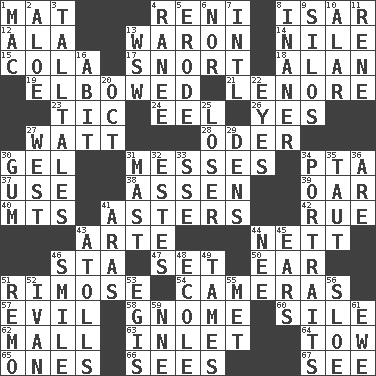 ACROSS 1. Floor covering 4. Painter Guido (1575-1642) 8. Austrian river, tributary to the Danube 12. Chicken ___ king 13. Make _____ (do battle with) 14. The longest river in the world 15. Root beer relative 17. Derisive sound 18. Actor Alda or Thicke 19. Turned at an angle; bent 21. Poe poem 23. Nervous spasm 24. Snakelike fish 26. It is so 27. Electrical Unit 28. Baltic tributary 30. Set 31. Makes clutter 34. Parent Teacher Assoc. 37. Purpose 38. NE Netherlands city 39. Rowing implement 40. Mountains (abbr.) 41. Michaelmas daisies 42. Regret 43. Johnson of "Laugh-In" 44. Remaining after all deductions 46. R.R. building 47. Put into a specified state 50. Ewer handle 51. Full of chinks, cracks, or crevices 54. Devices for capturing images 57. Morally bad or wrong 58. Dwarf 60. Drop; flow; fall 62. Promenade 63. An arm off of a larger body of water 64. Pull behind 65. Singles 66. Observes 67. Observe DOWN 1. Apple computer (short form) 2. _ vera 3. Baron Munchausen's specialties 4. The wife of a rajah (variant) 5. Eat (away) 6. Or not 7. International (abbr.) 8. More lacking in sense or substance 9. Grain storage towers 10. Having or resembling wings 11. French philosopher Descartes 13. Compass dir. 16. "This won't hurt ____!" 20. Sep. follower 22. Sight organs 25. Failure 27. Compass direction 29. Lairs 30. Chewing product 31. Vertical spar for supporting sails 32. _____ Park, CO 33. Compass dir. 34. Likenesses of persons 35. Strained 36. "We ___ not amused" (Victoria) 41. Ancient river in northeast Turkey 43. Ringlike coral islands and reefs 44. Born 45. Hearing organs 46. Grin 48. Learning spot: Fr. 49. Makes less strong or intense 51. San ____ (Riviera town) 52. "Terrible" tsar 53. Armor plate that protects the chest 55. Was introduced to 56. _ gin 59. Compass dir. 61. She-sheep