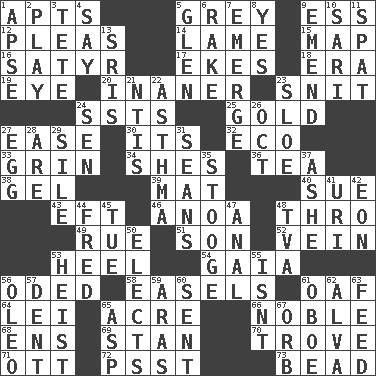ACROSS 1. Flats, for short 5. Jennifer or Joel 9. Curvy letter 12. Entreaties 14. Unable to walk 15. Atlas unit 16. Man with strong sexual desires 17. Makes supply last 18. Period 19. Sight organ 20. More empty; more void 23. In a ____ (agitated or irritated) 24. Fast planes 25. Aureate 27. Comfort 30. It is 32. Environmental prefix 33. Amused look 34. "______ My Girl" (Turtles hit) 36. Afternoon social gathering 38. Set 39. Floor protector 40. Take to court 43. Lizard (obsolete) 46. Small Philippine buffalo 48. Through, poetically 49. Regret 51. Manchild 52. Distinctive style or manner 53. The bottom of a shoe or boot 54. Greek goddess of the earth (variant) 56. Wrote a lyric poem 58. Artist's stands 61. Clumsy lout 64. Flowery wreath 65. 1/640 square mile 66. Having high moral qualities 68. Followers of ems 69. Comedian Laurel of Laurel & Hardy 70. Collection of objects 71. Baseball player Mel 72. Inconspicuous attention getter 73. Necklace unit DOWN 1. Domed church section 2. Shaw product 3. Wig 4. Declare 5. Small, secluded valley 6. Immoral or dissolute person 7. Develop 8. It is so 9. Make improvements or corrections to 10. Indian skirt 11. Petty quarrel 13. Indian titles of respect 21. Nuclear Threat Initiatives 22. Respiratory problem 23. _ gin 24. Elected rep. 26. Sep. follower 27. Ovum 28. "We ___ not amused" (Victoria) 29. Filth; sediment 31. Seines 35. Moe Howard, for one 37. American tennis player Robert 41. RI univ. 42. Period of immesurable duration 44. Flintstone 45. Third day of the wk. 47. Of or related to the anus 48. Federal power corp. 50. Opts 53. Robbery 55. Is not 56. Margarine 57. Gouge 59. Caspian sea tributary 60. Transmitted 61. Mitch Miller's instrument 62. Inventor's middle name 63. Nourish 65. Viper 67. Globe