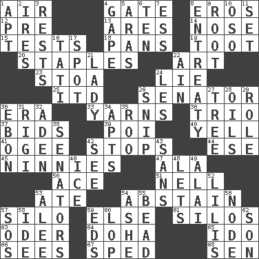 ACROSS 1. Wind 4. Yard entry 8. Greek god of love 12. Before (prefix) 13. Ancient Greek god of war 14. Characteristic smell of wine 15. Trials 18. Zero-star reviews 19. A blast of a horn 20. Paper fasteners 22. Tate display 23. Portico 24. Falsehood 25. It would 26. Legislator 30. Epoch 33. Tall tales 36. Musical group of three 37. Auction offers 39. Luau course 40. Shout 41. Double curve, resembling the letter S 42. Closes up, plugs up 44. Compass dir. 45. Simpletons 47. Wing 50. Adept person 51. 1994 drama film starring Jodie Foster 53. Had dinner 54. Refrain by choice 57. Grain storage tower 59. Otherwise 61. Grain storage towers 63. Baltic tributary 64. Capital of the state of Qatar 65. Wedding promise 66. Perceives with the eye 67. Broke a traffic law 68. Elected rep. DOWN 1. Fitting 2. Angers 3. Musical pauses 4. Open wide 5. Ancient river in northeast Turkey 6. Nine, plus one 7. Double-curved letter 8. Plea 9. Carrot, for example 10. Bear (Spanish) 11. Put into a specified state 16. Jacques of French films 17. Specific locale 21. Kenny Rogers chart-topper in '80 22. The 18th letter of the Arabic alphabet 24. French article 26. Clip 27. Relationship diagram 28. Petroleums 29. Hero or heavy, e.g. 30. Inky black, to poets 31. Swiss mountan, "Queen of the Mountains" 32. Arabian gulf 34. Tenement units (abbr.) 35. Friend of Pooh 38. Elected representatives 42. Observe 43. Without 46. Frozen water 48. Allows 49. Mountain range southwest of Kyrgyzstan 52. Ms. Damita and namesakes 53. Toward shelter 54. American tennis player Robert 55. Necklace unit 56. Connecting point 57. Distress signal 58. Binary compound 59. Begley and Asner 60. Chop off 62. Male offspring