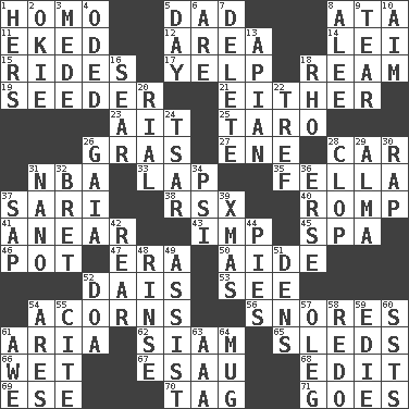 ACROSS 1. Same (prefix) 5. Male parent 8. _ moment's notice (2 wds.) 11. Made supply last 12. Type of rug 14. Flowery wreath 15. Amusement-park features 17. Sharp bark 18. 480, 500 or 516 sheets of paper 19. Sowing specialist 21. One or the other of two 23. Small island 25. Edible starchy tuberous root 26. Pate de foie ____ 27. Compass dir. 28. Automobile 31. Basketball assoc. 33. Pet locale 35. Man or boy (slang) 37. Indian skirt 38. Acura sports coupe 40. Play 41. Approach 43. Mischievous child 45. Health resort 46. Cooking vessel 47. Epoch 50. Helper 52. Raised platform 53. Observe 54. Oak nuts 56. Sounds asleep 61. Operatic vocal solo 62. Thailand, formerly 65. Bobsleighs 66. Dripping 67. Son of Isaac 68. Prepare for publication 69. Compass dir. 70. Label 71. Leaves DOWN 1. Possessive pronoun 2. Migrant worker of the '30s 3. Ancient Persian 4. Wrote a lyric poem 5. 24 hours 6. "We ___ not amused" (Victoria) 7. Keyboard key 8. Toward shelter 9. Pull apart 10. Direct toward a target or goal 13. Bee-related 16. Shrivel 18. 17th letter of the Greek alphabet 20. Monetary unit of Yemen 22. Unclean, religiously 24. Russian ruler of old 26. Greek goddess of the earth (variant) 28. Hoof sound 29. _ mater 30. Hit sharply and swiftly 31. Billionth: prefix 32. Cy Young winner Saberhagen 34. Air pressure measure (abbr.) 36. Celtic language 37. Plant excrement 39. Dec. holiday 42. Rump 44. Sliced desserts 48. Wash lightly 49. Help 51. Cub Scout units 52. ___ good deed 54. Ancient Greek god of war 55. Quote 57. Cassini of fashion 58. Do over again 59. Singer Brickell 60. Fast planes 61. Deep reverence 63. American Automobile Association (abbr.) 64. Large cup