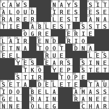 ACROSS 1. Crow sounds 5. Negative votes 9. Be seated 12. Verbally 14. Angers 15. Compass dir. 16. More valued for its uncommonness 17. For fear that 18. Santa ___, CA 19. Neckwear 20. Most capable 23. Fast planes 24. Legendary monster 25. 4th largest of the Great Lakes 27. Den 30. Conclude 32. _ de Janeiro 33. Inactive volcano in Sicily 34. A blast of a horn 36. Heredity factor (abbr.) 38. Snakelike fish 39. Regret 40. French article 43. It is so 46. Hearing organs 48. Trig term 49. Ring climax 51. Slangy assent 52. Proofreading order 53. Use a spoon 54. Drink excessively 56. Stalk of a moss capsule 58. Erase 61. The 19th letter of the Greek alphabet 64. Wedding promise 65. Actor Lugosi 66. Collect or gather 68. Set 69. Water falling in drops from the sky 70. The wife of a rajah (variant) 71. Compass dir. 72. Cassini of fashion 73. Burn to charcoal DOWN 1. Draw slowly or heavily 2. Jai _ 3. Had on 4. Take to court 5. "Death on the ____" 6. Ancient Greek god of war 7. Last 8. Fast jet (abbr.) 9. Gospel singer Marvin 10. Is not 11. Beverages made from leaves 13. To be drawn or hauled along 21. Cy Young winner Saberhagen 22. Poe poem 23. The Jewish people; Israel 24. Mouth or opening 26. To free from 27. Area sheltered from the wind 28. Had dinner 29. Inwardly 31. A city in N France, SE of Calais 35. Cigar-shaped 37. Came down and settled, as after flight 41. Compass dir. 42. Put into a specified state 44. Singer James 45. What Jean-Claude Killy likes to do 47. Blemish 48. Compass dir. 50. Severe or trying experience 53. Fur scarf 55. Lightbulb-shaped fruit 56. Signal 57. Genesis locale 59. Writer Wiesel 60. Long (Scottish) 61. Hyperbolic tangent 62. Toward the sea 63. One who uses or employs something 65. Sis' sibling 67. Apple computer (short form)