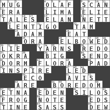 ACROSS 1. Large cup 4. Norwegian king 8. Examine minutely or intensely 12. Epoch 13. Pale green bean 14. Writer Wiesel 15. Lies 18. Liveliness 19. Remaining after all deductions 20. Small, flat, pigmented spot on the skin 22. Scottish cap 23. First man 24. Consume 25. Mouth or opening 26. Shoved, as through a crowd 30. Whopper 33. Entertaining tales 36. Do over again 37. Gumbo ingredient 39. Massive 40. Post 41. Dormintory (informal) 42. Plants 44. Groovy apt. 45. Motivate 47. Directed 50. Environmental prefix 51. Opinion 53. "We ___ not amused" (Victoria) 54. Mood resulting from idleness 57. Inactive volcano in Sicily 59. Paradise 61. Grain storage towers 63. Tree-dwelling hopper 64. Brief written record 65. Begley and Asner 66. Prong on a fork 67. Backtalk 68. Morning condensation DOWN 1. Was introduced to 2. Mountain range 3. An organ shaped like a helmet 4. Cassini of fashion 5. _ and Stitch 6. Nursemaid (var.) 7. Avid follower 8. Elected representatives 9. Clement's nick name 10. Small island 11. Fish or hair follower 16. Inside; within (prefix) 17. Play the lead 21. "If ____ say so..." 22. Keyboard key 24. Raised railways 26. Engineer (abbr.) 27. Shed a tear 28. Pulitzer Prize-winning author Ferber 29. Texas town _ City 30. Farming town in central California 31. Visual representation of an object 32. Blunders 34. Competent 35. River (Sp.) 38. Electrical Measurement 42. Away 43. Having or resembling wings 46. Frozen water 48. Nights before holidays 49. "You Light Up My Life" star Conn 52. Having a sole or soles 53. Soon (poet.) 54. Stakes 55. Singles 56. Method 57. Newt 58. Three (prefix) 59. Followers of ems 60. ___ good deed 62. Compass dir.