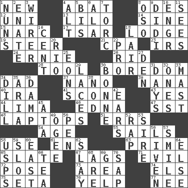 ACROSS 1. ___ Haven, CT 4. Blind as ____ 8. Lyric poems 12. Single; one (prefix) 13. _ and Stitch 14. Trig term 15. Drug cop 17. Russian ruler of old 18. Cabin 19. Bull 21. Accounting whiz (abbr.) 23. Big collection agency 24. Bert's buddy 26. To free from 28. Instrument 30. Mood resulting from idleness 34. June honoree 37. Billionth: prefix 39. Grandmother 40. Retirement account (abbr.) 41. Biscuitlike quick bread 43. It is so 44. Pale green bean 46. Pulitzer Prize-winning author Ferber 47. Fast jet (abbr.) 48. Portable computers 51. Blunders 54. Grow older 55. Travel by water 58. Purpose 61. Followers of ems 63. First class 65. Schedule 67. Falls behind 71. Tending to cause great harm 72. Introduce or present, as a question 73. Type of rug 74. Raised railways 75. Stalk of a moss capsule 76. Sharp bark 77. Born DOWN 1. Religious women 2. Maternal 3. One who wires 4. Keyboard modifier key 5. Twice 6. According to 7. Torque (variant) 8. Bear (Spanish) 9. "You Light Up My Life" star Conn 10. Engineer (abbr.) 11. Perceives with the eye 16. Penny 18. Den 20. _ de Janeiro 22. Adept person 25. Immeasurably long periods of time 27. Lair 29. Shoestrings 30. Maid-servant 31. 24-hour periods 32. Singles 33. Vertical spar for supporting sails 34. Deli pickle 35. Roberta Peters solo 36. Moist 38. Allow head to fall sleepily 42. Hearing organs 45. "One Day ___ Time" 49. Double curve, resembling the letter S 50. Writing instrument 52. Hit sharply and swiftly 53. Title for a man of rank and authority 56. Make or become more lively 57. Grin 58. United States Postal Service (abbr.) 59. _ gin 60. Compass direction 62. Kill 64. Otherwise 66. Beverage made from leaves 68. "We ___ not amused" (Victoria) 69. Set 70. Plant excrement