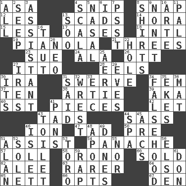 ACROSS 1. White ___ sheet 4. Clip 8. Fastener 12. French article 13. Loads 14. Israeli folk dance 15. For fear that 17. Fertile tracts in a desert 18. International (abbr.) 19. Player piano 21. Triplets 23. Take to court 24. Chicken ___ king 26. Baseball player Mel 27. "Tell ____ the Marines!" 28. Snakelike fish 30. Lyricist Gershwin 31. Turn aside suddenly 34. Opposite of masc. 37. Nine, plus one 38. Nick name for Arthur 39. Alias (abbr.) 40. Fast jet (abbr.) 41. Parts 42. Allow 43. Small boys 44. Backtalk 46. Electrically charged atom 47. Bit 50. Before (prefix) 51. Help 54. Flamboyance 57. Hang loosely or laxly 58. U. of Maine site 60. Disposed of to a purchaser 62. Toward shelter 63. More uncommon 64. Bear (Spanish) 65. Remaining after all deductions 66. Elects 67. Lair DOWN 1. Everything 2. Ooze 3. Aide 4. Any of the three canals of the cochlea 5. Relating to the nose 6. Binary compound 7. Inconspicuous attention getter 8. Chest coverings 9. Music written for nine 10. Johnson of "Laugh-In" 11. Friends 13. "Barney Miller" actor Jack 16. Tense 20. Modern: prefix 22. Hollow 25. Nest on high 27. Angers 29. Nights before holidays 30. It is 31. Expressed in words 32. Take or capture by force 33. And so on (abbr.) 34. It jiggles the polygraph 35. Supplements with great effort 36. Floor covering 41. Zero-star reviews 43. Bathroom 44. Health resort 45. Arches 46. Small island 48. To the left, to Queeg 49. Natives or inhabitants of Denmark 51. ____ Jay Lerner 52. Flatfish 53. "Corrida" creature 55. And not 56. Otherwise 59. Reproach for some lapse or misdeed 61. Spanish title
