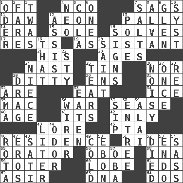ACROSS 1. Often (poetically) 4. Non-commissioned officer (abbr.) 7. Droops 11. Simpleton 12. A really long time 13. Friendly 14. Period 15. Not divided or shared with others 16. Finds the solution 17. Musical pauses 19. Helper 21. Part of HMS, perhaps 23. Eons 24. Political cartoonist Thomas 25. Metal container 26. Or not 29. Short, simple song 30. Followers of ems 31. Single 32. "We ___ not amused" (Victoria) 33. Consume 34. Frozen water 35. Apple computer (short form) 36. Armed conflict 37. Gospel singer Marvin 40. Ripen 41. It is 42. Inwardly 43. Old wives' tales, e.g. 45. Parent Teacher Association (abbr.) 46. Dwelling 51. Amusement-park features 55. Speaker 56. Mitch Miller's instrument 58. _ tizzy (2 wds.) 59. Carrier 60. Ear part 61. Begley and Asner 62. SW Saudi Arabia district 63. Heredity factor (abbr.) 64. Two (Sp.) DOWN 1. Baltic tributary 2. Conductor's collection 3. It was, poetically 4. Modern: prefix 5. Root beer relative 6. Washington bills 7. Table seasonings 8. Inventor's middle name 9. Small, secluded valley 10. System (abbr.) 12. Help 13. Airs 16. Signals 18. Not this but _ 20. Virtuous person 22. Filthy place 24. Sibling's daughter 25. Pulls into pieces 26. Annoyingly loud 27. Single time 28. Portuguese money of account (variant) 29. To trail on the ground 32. Wet nurse (var.) 33. Consumed 36. One who wires 37. Small drink 38. Main course 39. Jai ____ 43. 61 cubic inches 44. Aroma 46. Roll call or roster of names 47. Greek god of love 48. Suttee (variant) 49. Having a low temperature 50. Inky black, to poets 52. Passed on 53. Inside; within (prefix) 54. Backtalk 57. Chief or king in Benin or Nigeria
