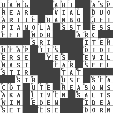 ACROSS 1. Mild oath, euphamism for damn 5. Nonscientific branch of learning 8. Cleo's killer 11. Located in or toward the back 12. Small bottle 14. Superhero pair 15. Nick name for Arthur 17. Role for Stallone 18. Type of plane 19. Player piano 21. Fast jet (abbr.) 22. Curvy letter 23. Snakelike fish 24. And not 25. Curve 27. _ Lanka 28. A whole individual unit 31. Pile 35. ___ a Wonderful Life 37. "You Light Up My Life" star Conn 38. Celtic language 39. It is so 41. Tending to cause great harm 42. Political cartoonist Thomas 43. Hearing organ 45. Sew up the eyelids of hawks and falcons 46. Use a spoon 47. Make lace 49. Title for a knight 51. Purpose 52. Ocean 55. Small bed 57. Shoshoni 60. Thinks logically 62. Alias (abbr.) 63. Make or become more lively 65. Table seasonings 66. Victory 67. Genesis locale 68. It may be bright or harebrained 69. Arrange properly for use 70. Compass dir. 71. Dormintory (informal) DOWN 1. Window treatment 2. Nest on high 3. Brizilian seaport 4. Smile widely 5. Actress Gardner 6. Basketball hoops 7. Bar bills 8. Descriptive word 9. Takes to court 10. Plant holders 13. Globular water bottle used in Asia 16. Immeasurably long periods of time 17. Noteworthy scarcity 20. Australian parrot (variant) 26. Amusement-park features 29. Singer Brickell 30. Place where flour is made 31. Coop moms 32. Part of Q.E.F. 33. Helper 34. _ dish (used to culture cells) 36. Observe 40. Titan orbits this 44. Raze (variant) 48. Beverages made from leaves 50. Governing power 52. Twentieth part of a lira 53. Keyboard key 54. Indian state 55. Crow sounds 56. Migrant worker of the '30s 58. Periodic rise and fall of the sea level 59. Nights before holidays 61. Stated 64. Compass dir.