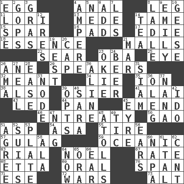 ACROSS 1. Ovum 4. Of or related to the anus 8. Part of a journey 11. Australian parrot (variant) 13. Ancient Persian 14. Docile 15. Coast Guard woman 16. Writing tablets 17. Singer Brickell 18. Substance 21. Shopping centers 22. Shrivel 23. Chief or king in Benin or Nigeria 25. Sight organ 26. A saturated hydrocarbon 29. Orators 32. Intended 34. Untruth 35. Electrically charged atom 38. In addition 39. Flexible twig of a willow tree 41. Jai _ 43. Directed 44. Baking dish 45. Make improvements or corrections to 46. Plea 50. E Mali city 51. Viper 54. White ___ sheet 55. Become fatigued 57. POW camp 59. Pertaining to the sea 63. Monetary unit of Yemen 64. Christmas carol 67. Pace 68. Singer James 69. Relating to the mouth 70. Connect, as a bridge 71. Compass dir. 72. Armed conflicts 73. Keyboard modifier key DOWN 1. Otherwise 2. Republicans 3. Pate de foie ____ 4. Electrical Unit 5. Teachers' org. 6. Find the sum of 7. French article 8. Dipping utensil 9. Poet Dickinson 10. Honkers 12. Angers 14. Afternoon social gathering 19. Egg locale 20. Head covering 21. Make imperfect 23. Migrant worker of the '30s 24. Fermented drink made from hops 26. Nursemaid (var.) 27. 1994 drama film starring Jodie Foster 28. Comfort 30. Place in a line 31. Thailand, formerly 33. Thickened enlargement 36. Cassini of fashion 37. Nanny 39. Chooses 40. "Two Mules for Sister ____" 42. Wedding promise 45. Jane of fiction 47. Tired old horse 48. Ringlike coral islands and reefs 49. Nervous spasm 51. Match 52. Sets of matching outer garments 53. Food holder 56. Hearing organs 58. According to 60. California wine valley 61. Slanted text style (abbr.) 62. Penny 64. At this time 65. Mouth or opening 66. Ewer handle