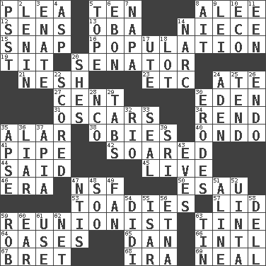ACROSS 1. Entreaty 5. "___ Little Indians" 8. Toward shelter 12. Elected reps. 13. Chief or king in Benin or Nigeria 14. Sibling's daughter 15. Fastener 16. Census information 19. Teat (slang) 20. Legislator 21. Delicate 23. And so on (abbr.) 24. Had dinner 27. Penny 30. Locale of original sin 31. Motion picture awards 34. Tear apart 35. Having or resembling wings 38. Off-Broadway awards 40. Southwest Nigerian state 41. Corncob 42. Flew 44. Alleged 45. Not recorded 46. Epoch 47. Science/research agcy. 50. Son of Isaac 53. Sycophants 57. Flaplike covering 59. One who advocates reunion 63. Prong on a fork 64. Fertile tracts in a desert 65. One of the 12 tribes of Israel 66. International (abbr.) 67. Cy Young winner Saberhagen 68. Retirement account (abbr.) 69. Actress Patricia DOWN 1. Inconspicuous attention getter 2. Soviet premier 1918-24 3. Maternal 4. Cleo's killer 5. Drink excessively 6. Inky black, to poets 7. California wine valley 8. Small island 9. Luau accessory 10. Environmental prefix 11. Car or cant ending 14. Drug cop 17. Shoshoni 18. Car dealer's back yard 20. "______ My Girl" (Turtles hit) 22. Tallied 24. Arabian gulf 25. Watch over 26. Inside; within (prefix) 28. Non-commissioned officer (abbr.) 29. Bar bills 30. Eats (away) 32. _ de Janeiro 33. Lick closed 35. Domed church section 36. One who doesn't tell the truth 37. Capital of Western Samoa 39. _ Lanka 43. Nights before holidays 47. Nuclear Threat Initiatives 48. "Barney Miller" actor Jack 49. Air blower 51. Place in a line 52. National forest in Provo, Utah 54. "You Light Up My Life" star Conn 55. Austrian river, tributary to the Danube 56. Inactive volcano in Sicily 58. Small valley 59. Director Reiner 60. Hearing organ 61. Purpose 62. Fish or hair follower 63. Shallow baking pan